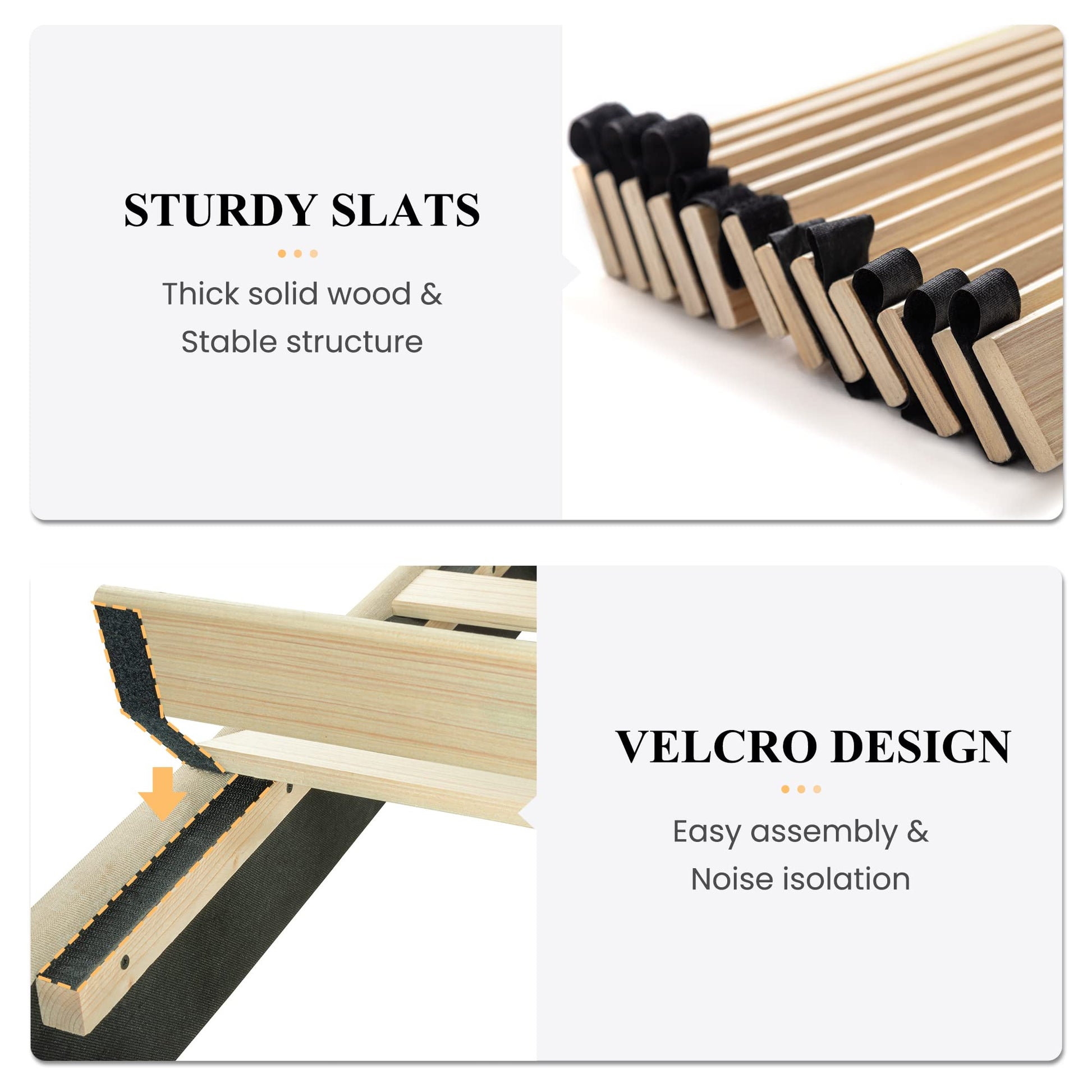 - Easy Assembly:All parts and tools are smartly packed into one box. Velcro is used on slats to help to quicken the assembly and eliminate noise. The assembly of the bed could be finished within one hour.
