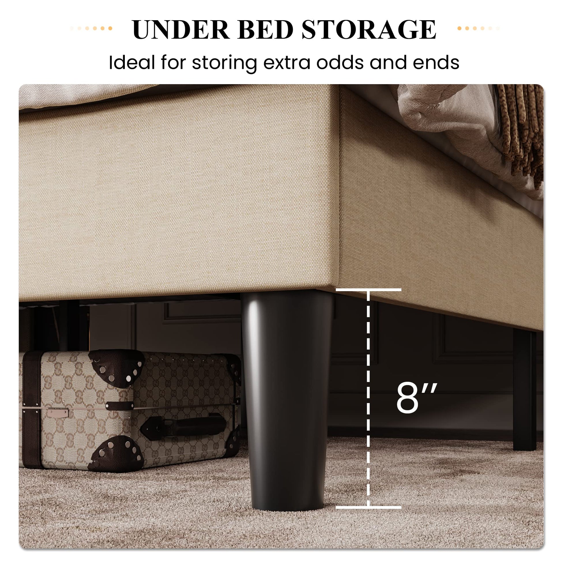 - Ample Storage Space: With 8 inches of under-bed storage, our bed frame offers plenty of room for you to store your belongings and keep your bedroom neat and organized.