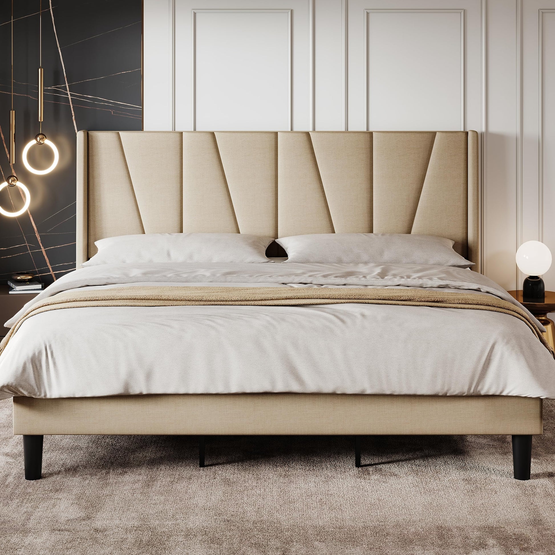 King Size Bed Frame with Geometric Wingback Headboard, Upholstered Platform Bed