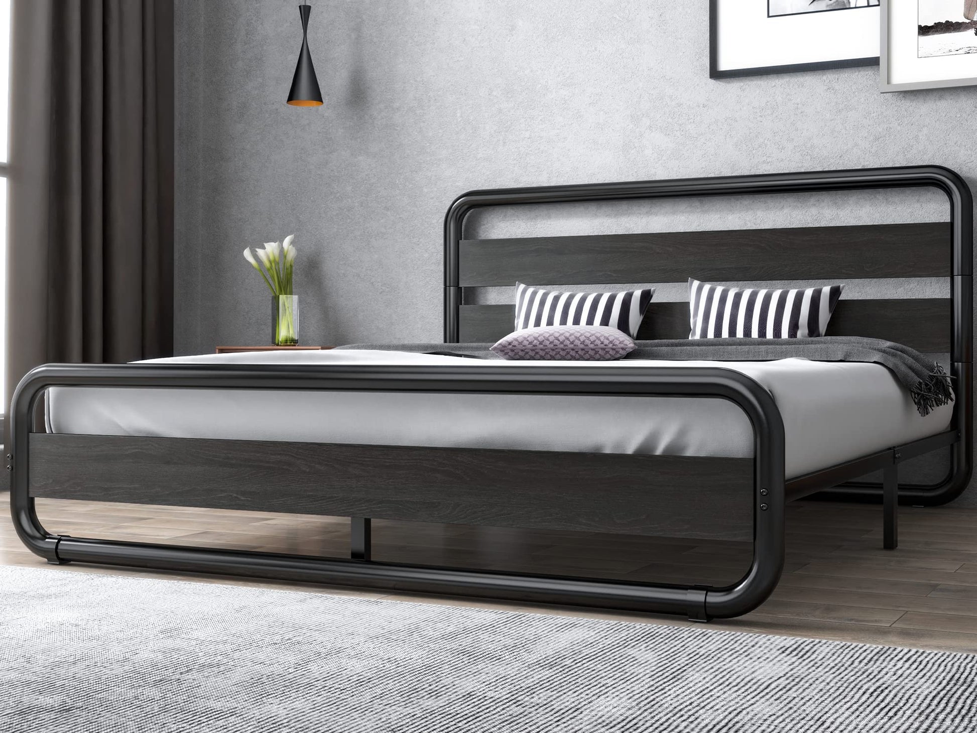King Size Metal Bed Frame with Wooden Headboard and Footboard, Heavy Duty Platform