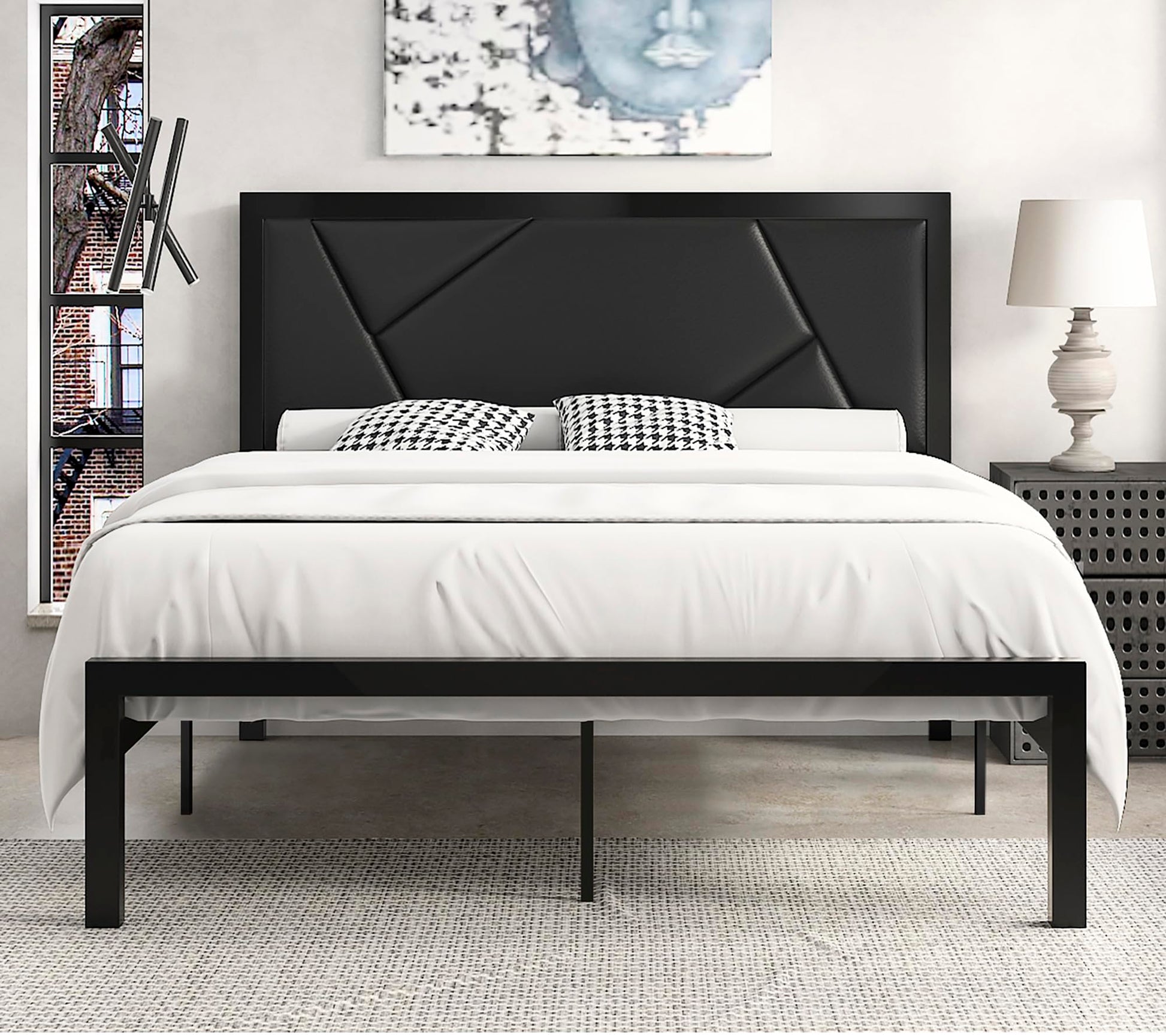 SHA CERLIN Modern Queen Size Metal Bed Frame with Litchi Grain Leather Upholstered Headboard, No Box Spring Needed, 12.4" Underbed Storage, Black