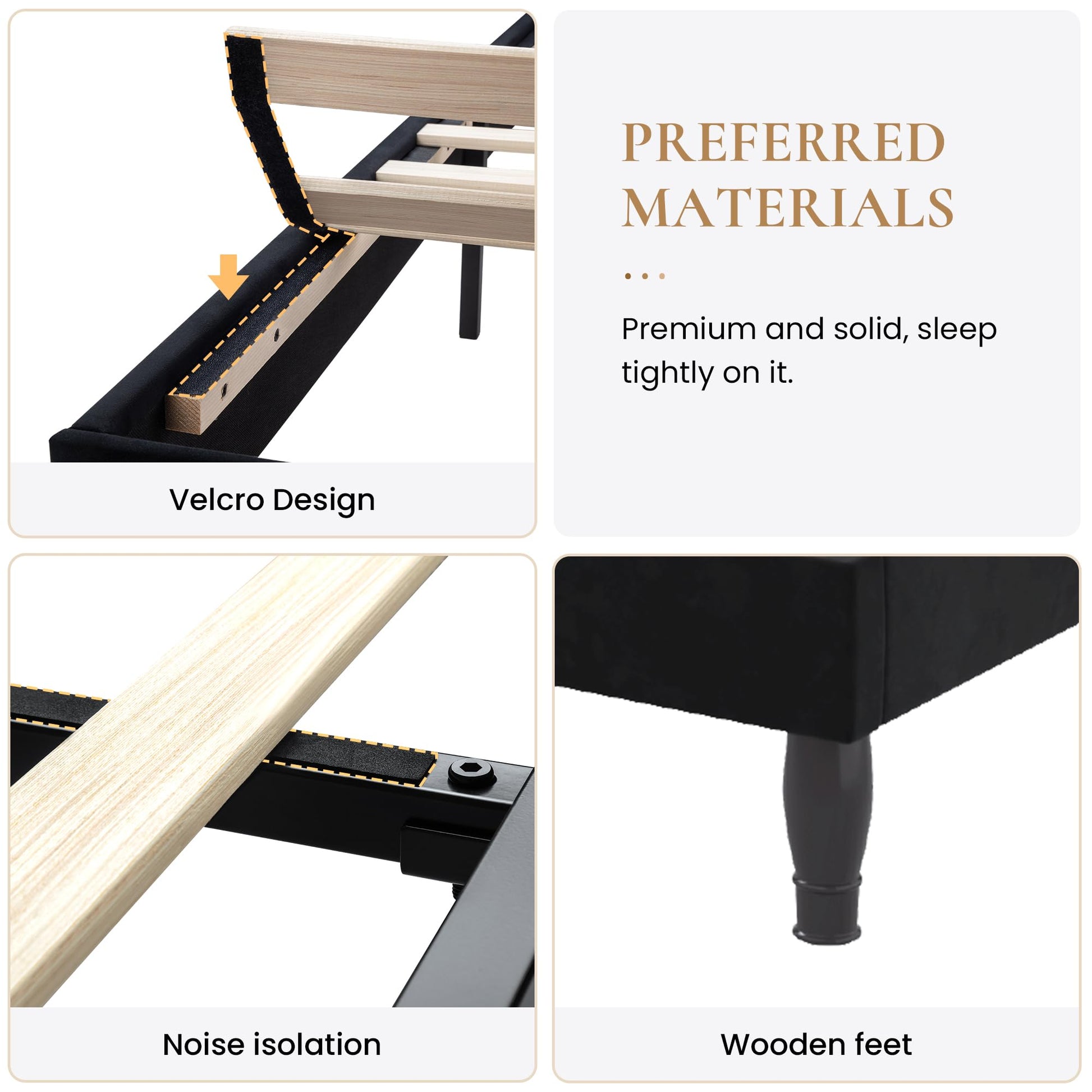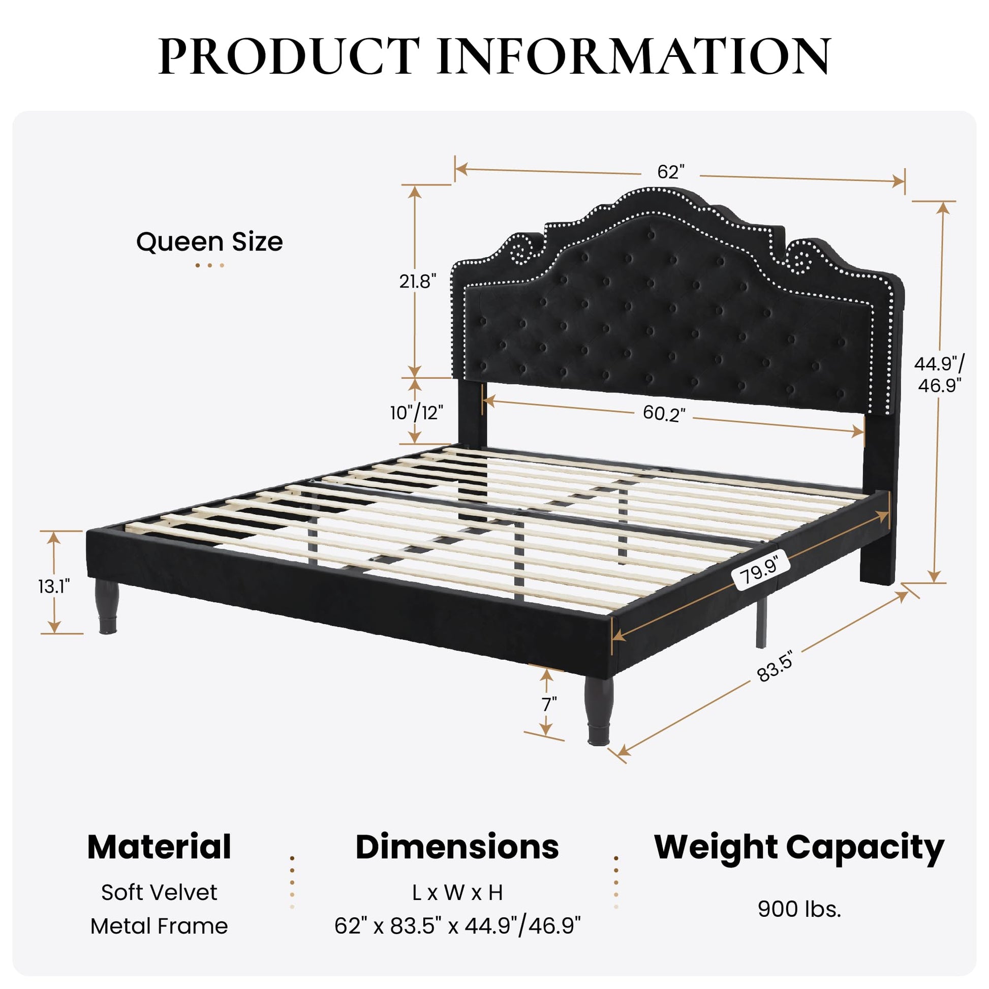 - High-Quality Material: The velvet upholstered queen bed frame with headboard provides a soft and comfortable feel, while the diamond button tufting and metal studs add a unique and luxurious touch.