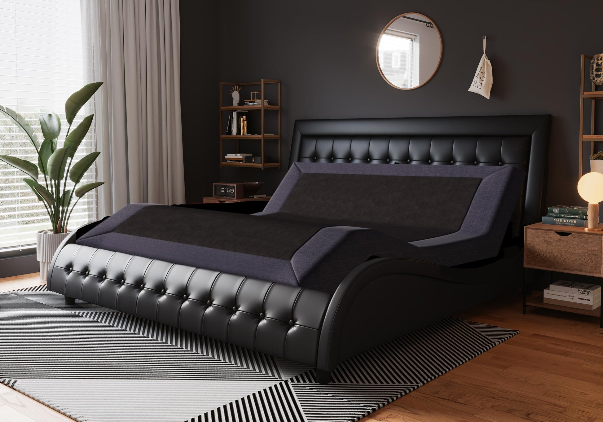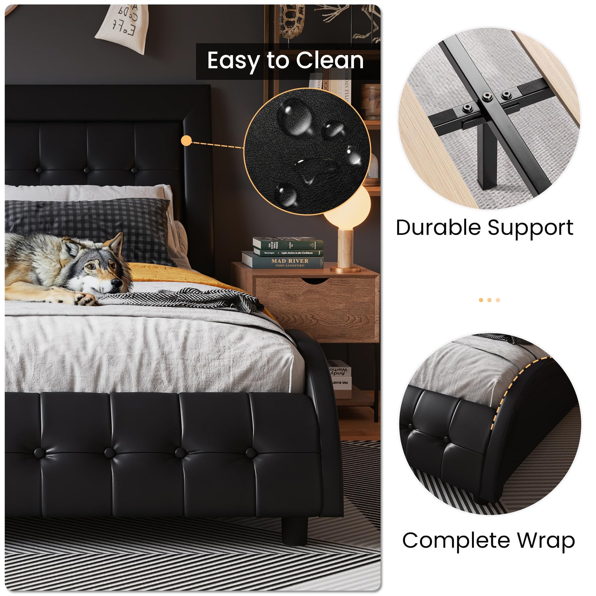 - A striking black deluxe faux leather upholstery and padded headboard with vertical stitching, this bed is the perfect way to upgrade your bedroom's look.