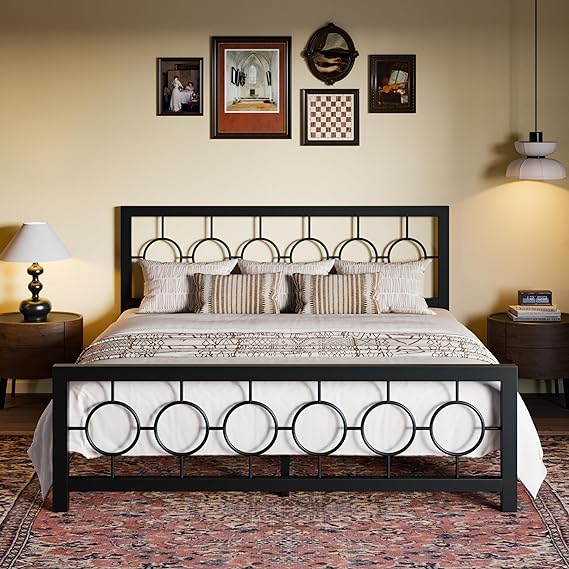 Queen Size Metal Bed Frame with Vintage Circular Design Headboard and Footboard