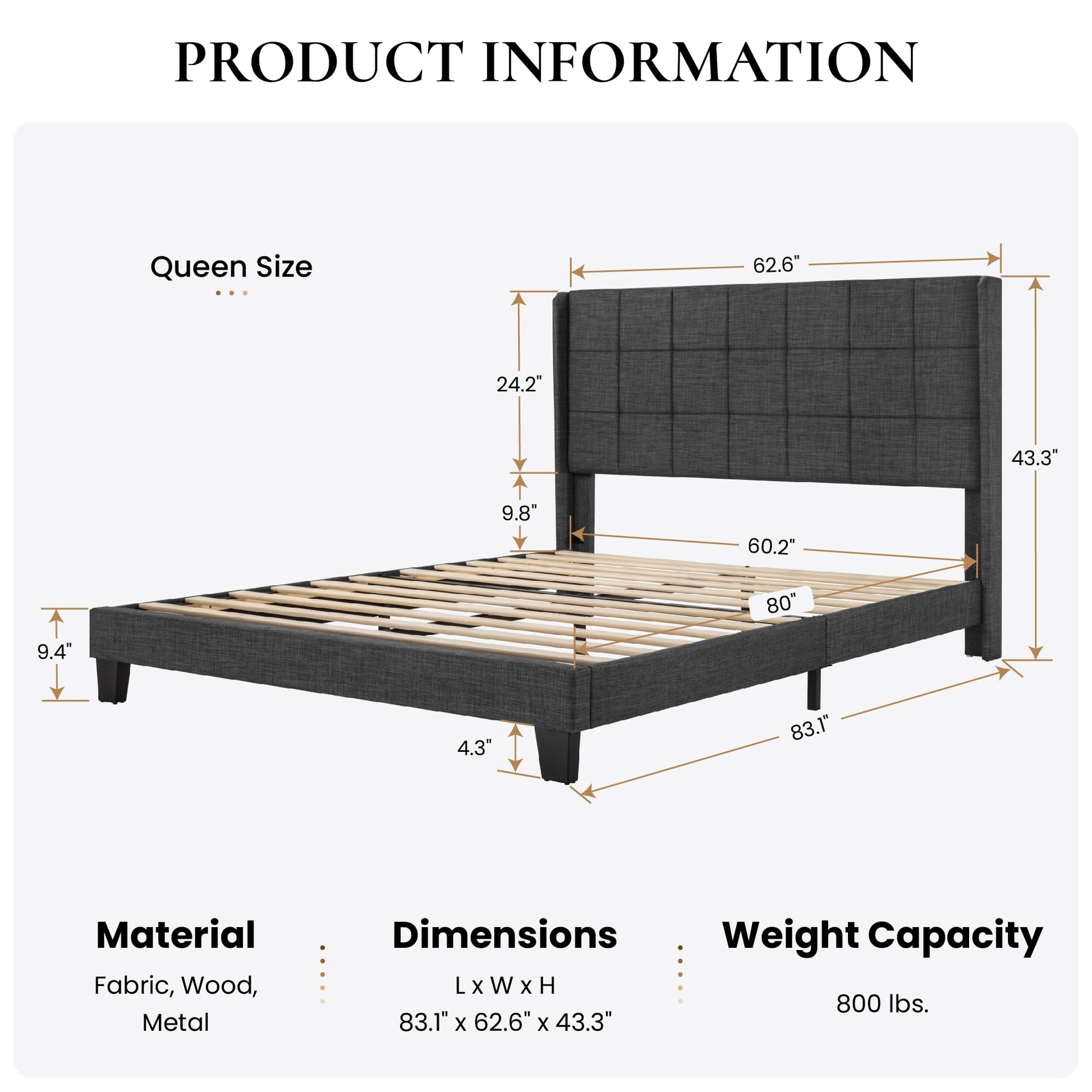 Queen Upholstered Bed Frame with Square Tufted Headboard and 5.5" Wingback