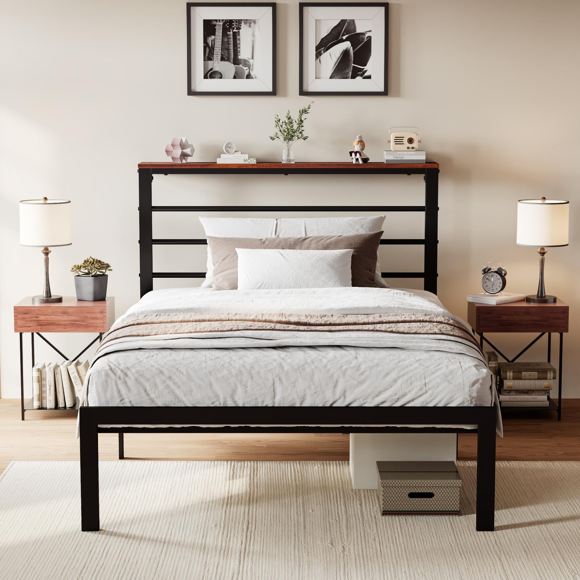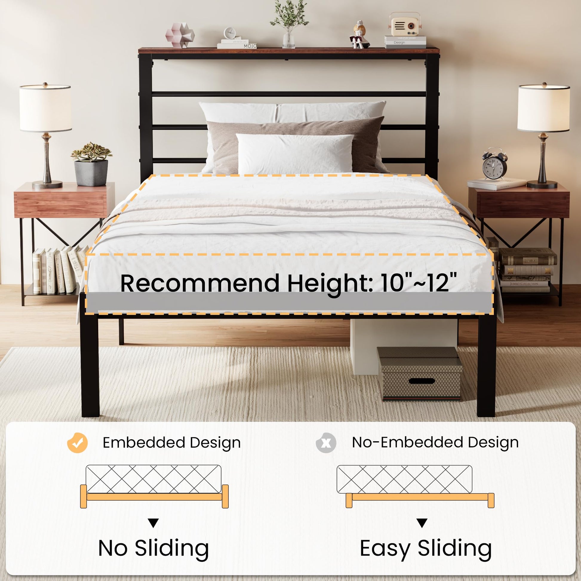 Twin Size Bed Frame with Headboard Shelf, Heavy Duty Platform Bed Frame with Strong