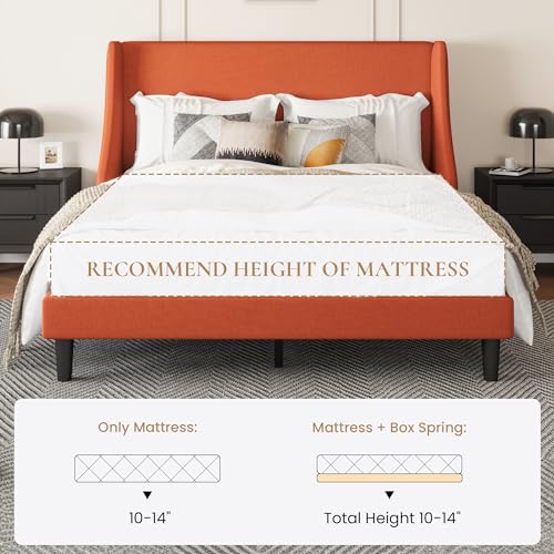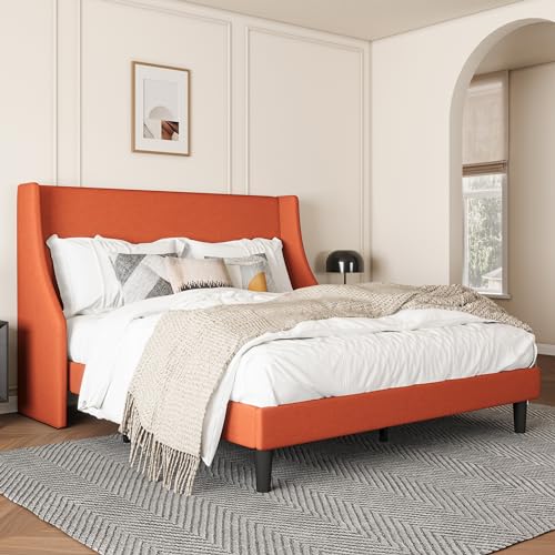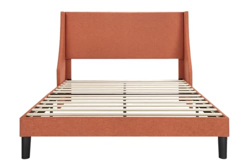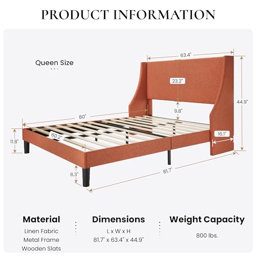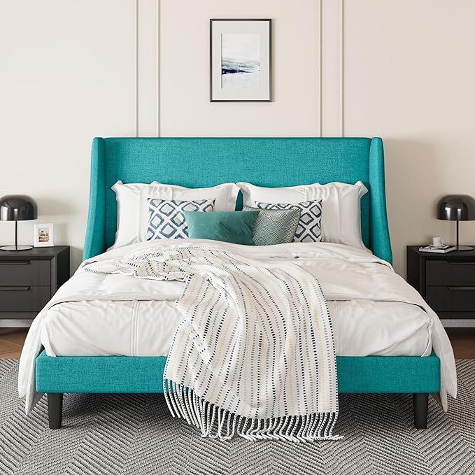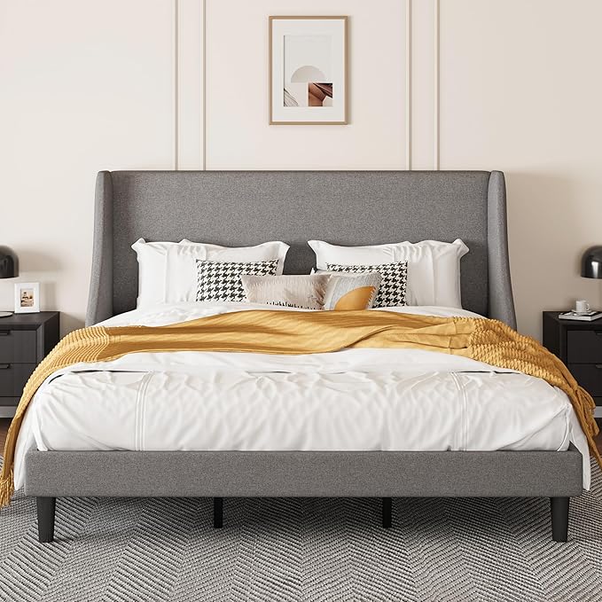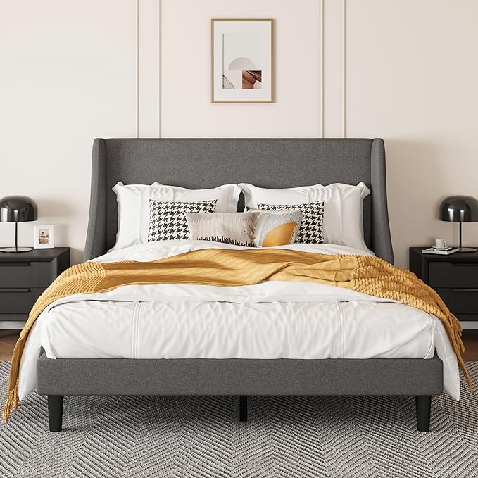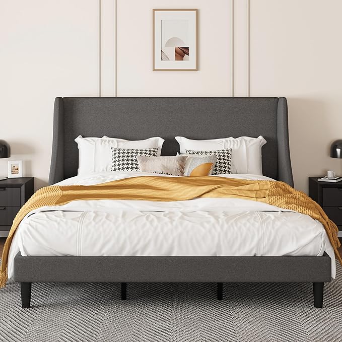 Upholstered Bed Frame Queen Size with Streamlined Wingback Headboard,