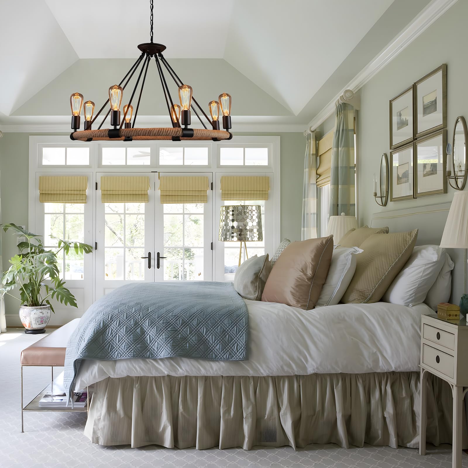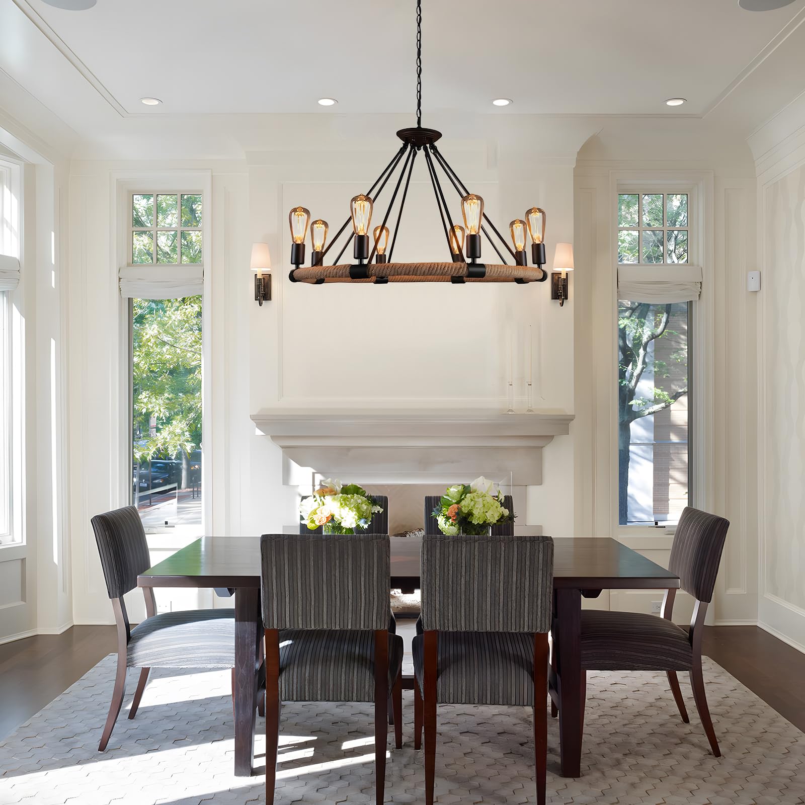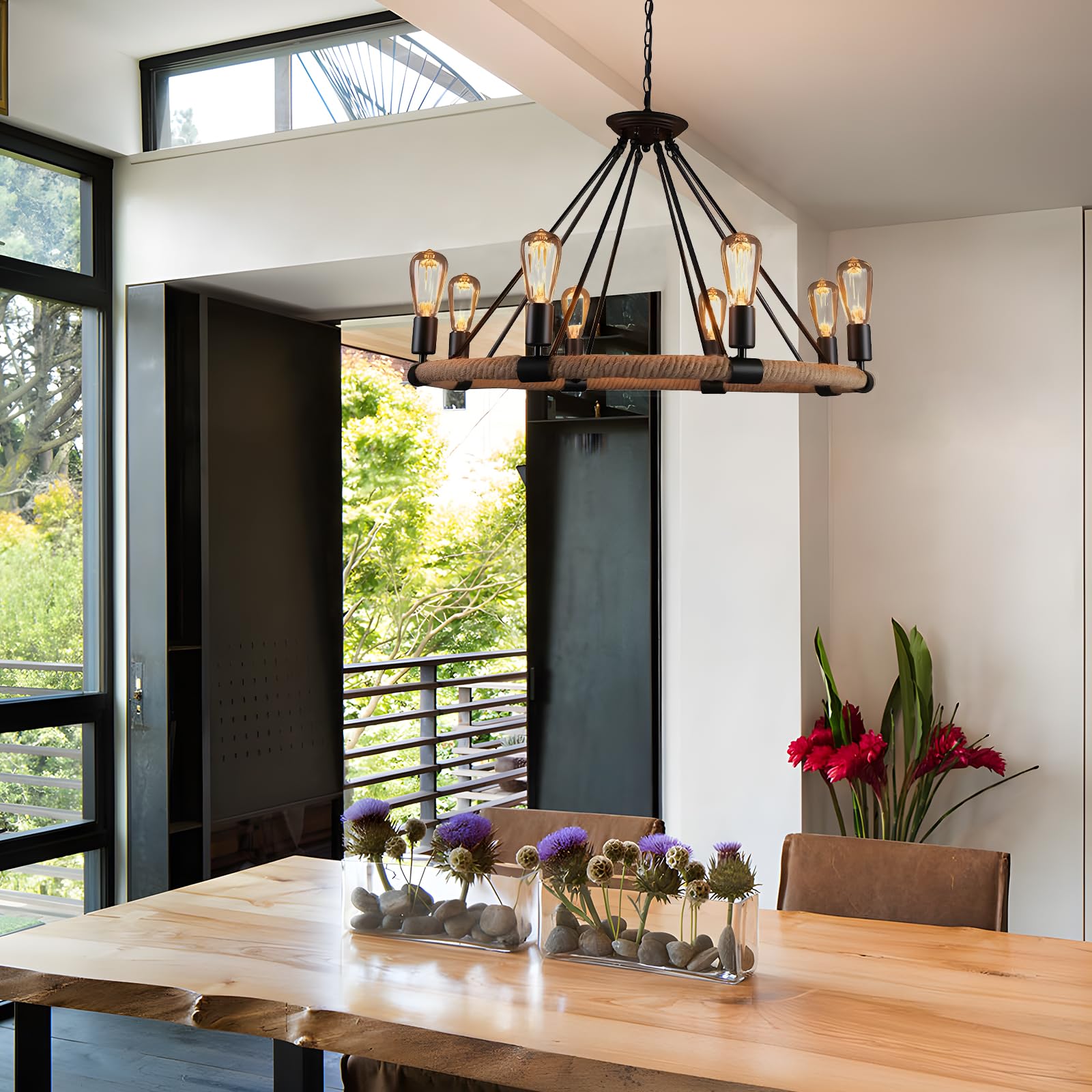 - Vintage Ambiance: Inspired by the iconic wagon wheel design, this black chandelier creates an inviting, vintage-inspired ambiance that will elevate any space. Crafted with a sturdy metal frame and accented by natural hemp rope, this farmhouse light fixture effortlessly blends industrial and natural elements for a truly one-of-a-kind look