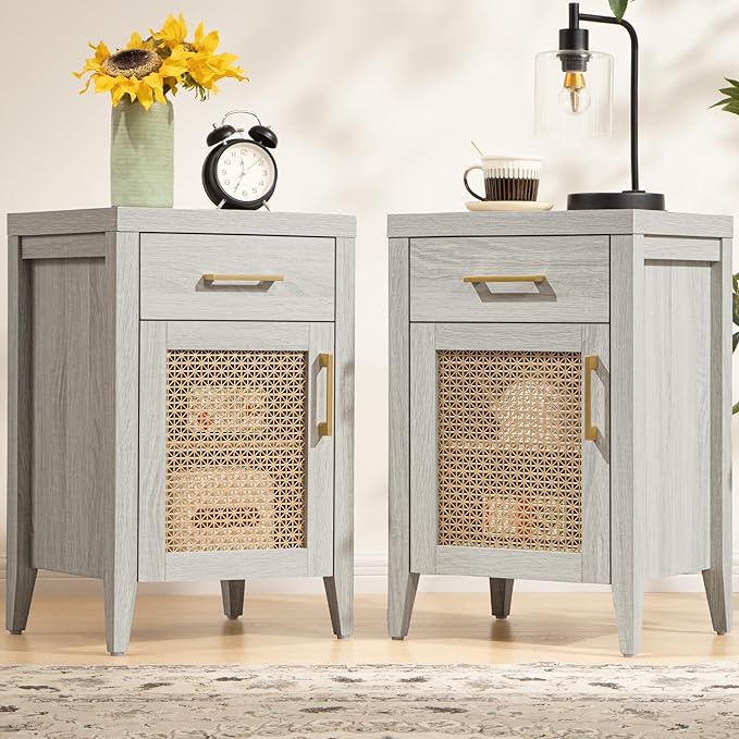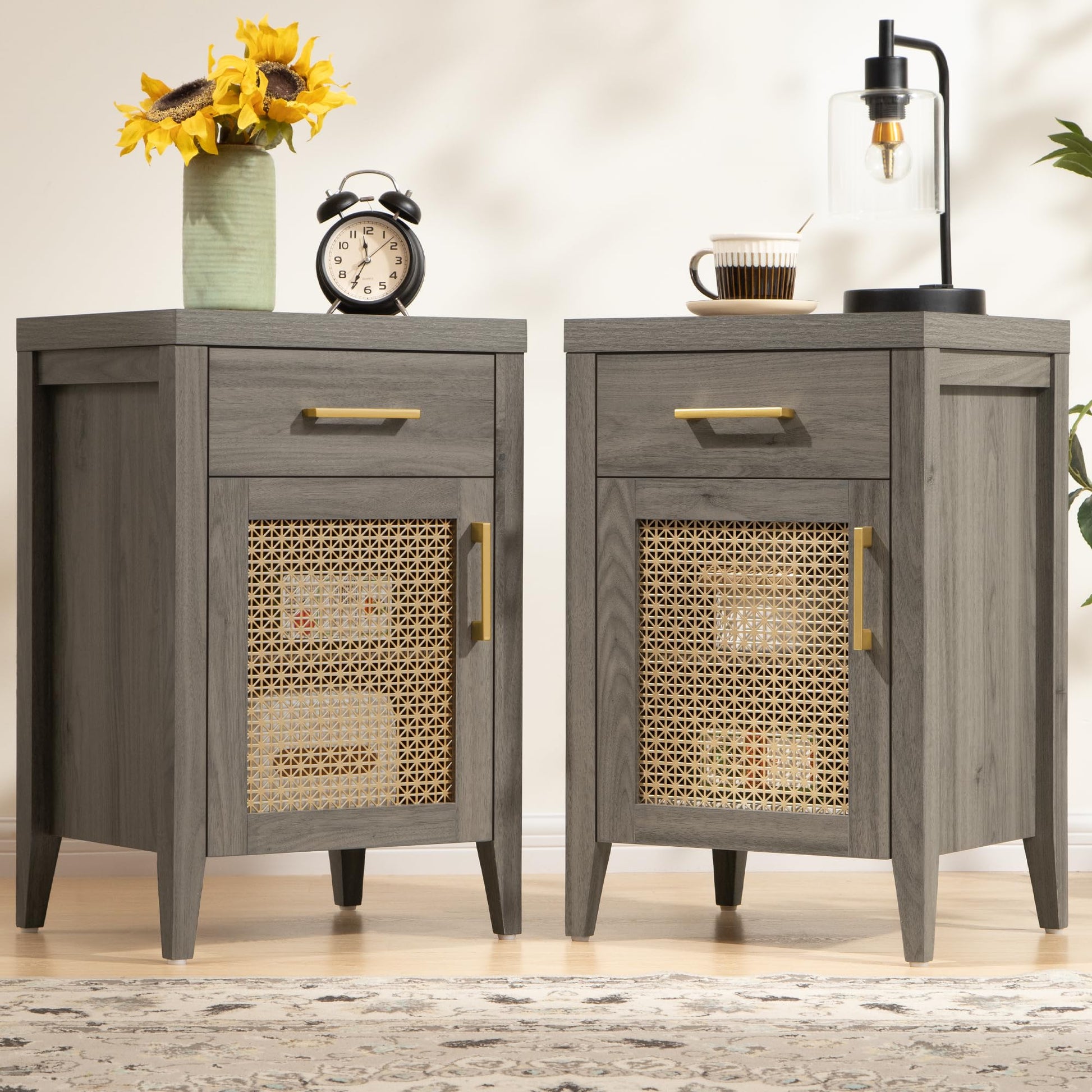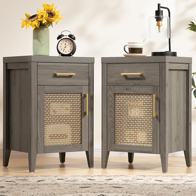 - With its gray oak finish and gold-patterned mesh door, this tall night stand exudes farmhouse charm with a touch of chic, seamlessly blending into your room's style.