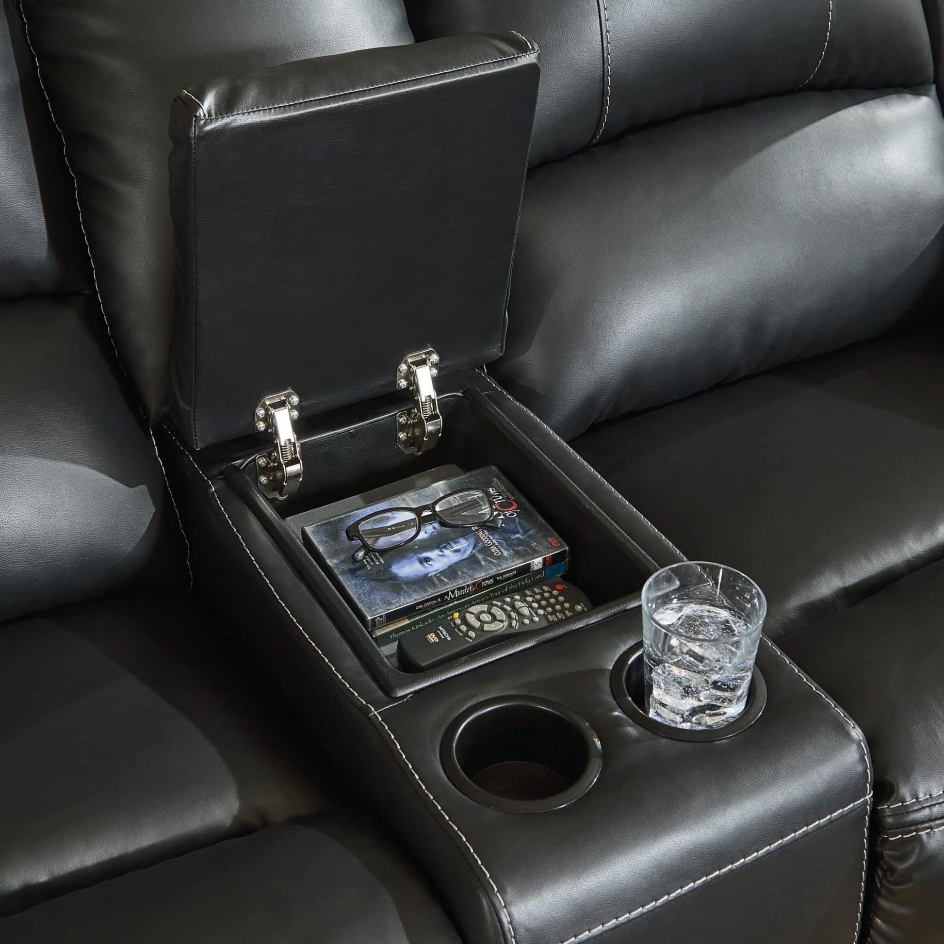- STYLE & SUBSTANCE: Indulgent cushions, pillow top arm rests, contrast stitching and a storage console with 2 cup holders set the scene for a lazy lounge experience