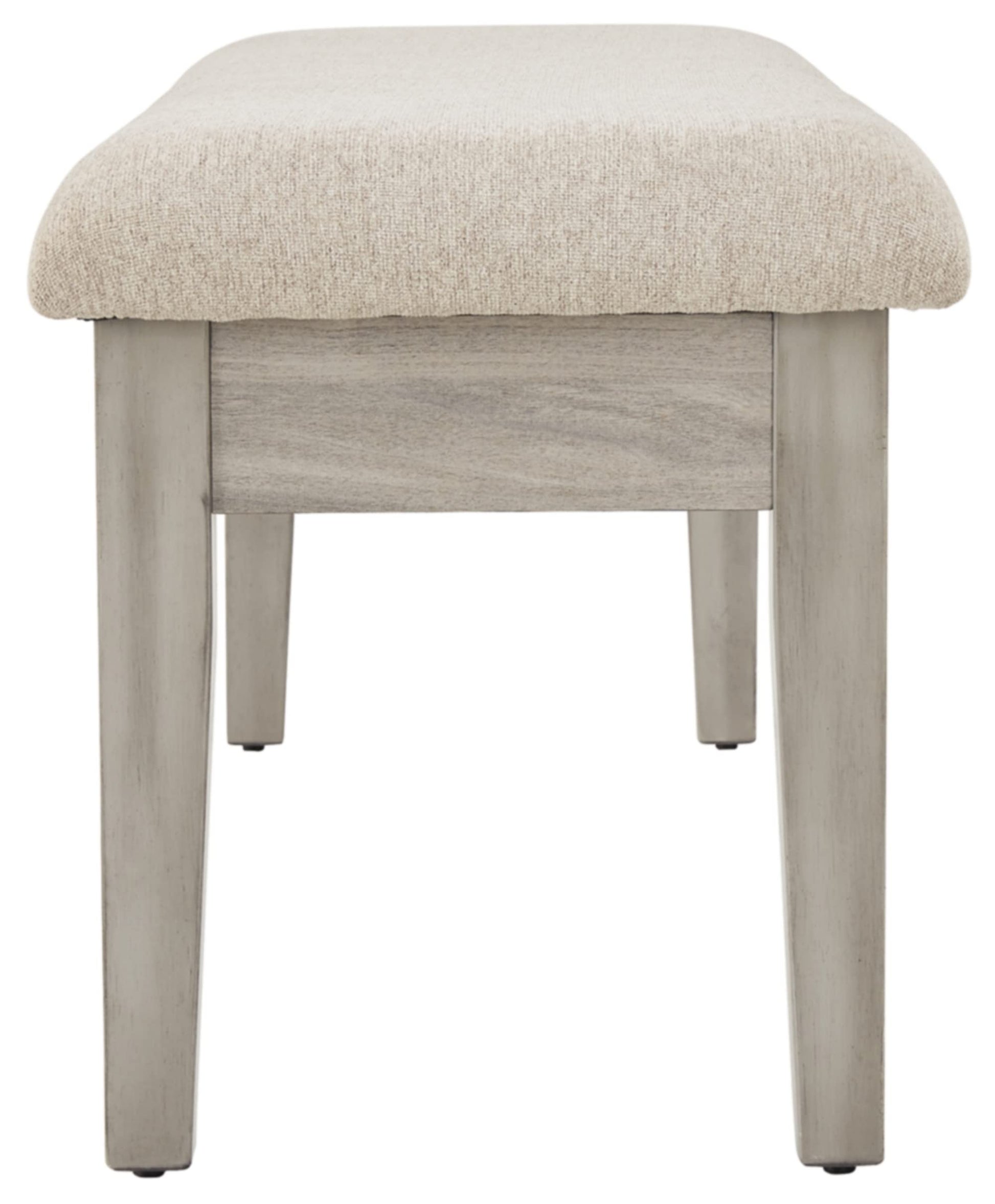 - This relaxed yet refined dining bench adds a farmhouse vibe to your space. Its gray finish is utterly on-trend. The seat is covered in easy-care polyester upholstery