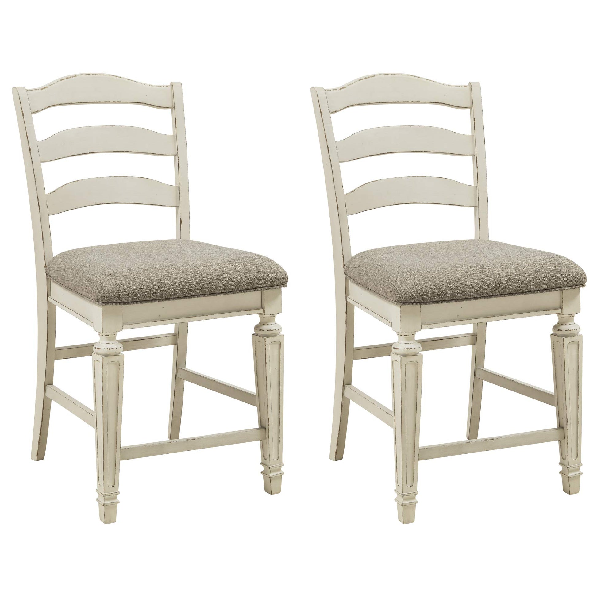 - With its rounded ladderback styling, chipped white finish, and plush cushioned seat, this set of 2 counter-height barstools has all the right ingredients