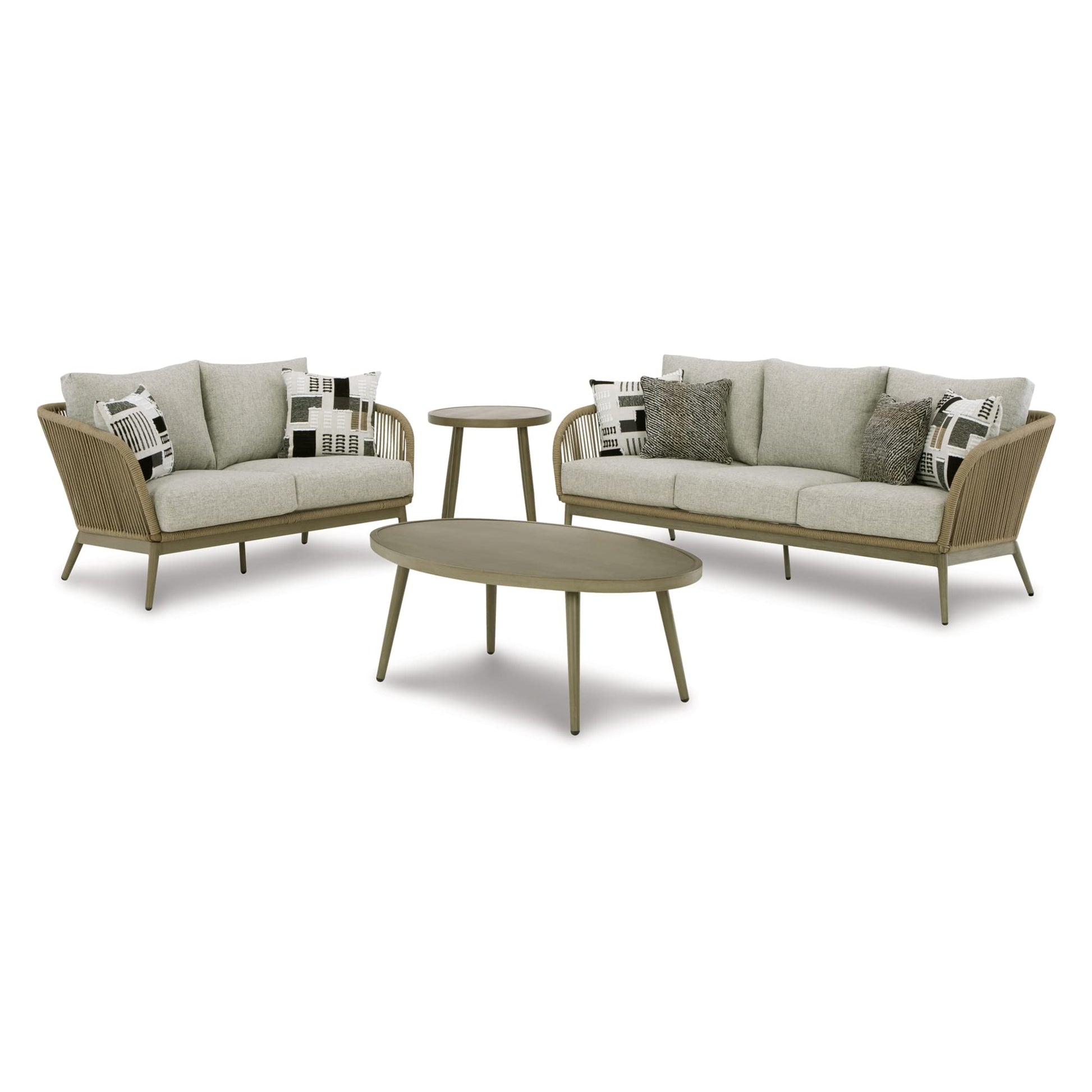 - PLUSH COMFORT: Soft, high-performance beige Nuvella Premium polyester fabric covers an all-weather foam cushion core. 4 throw pillows add a splash of color