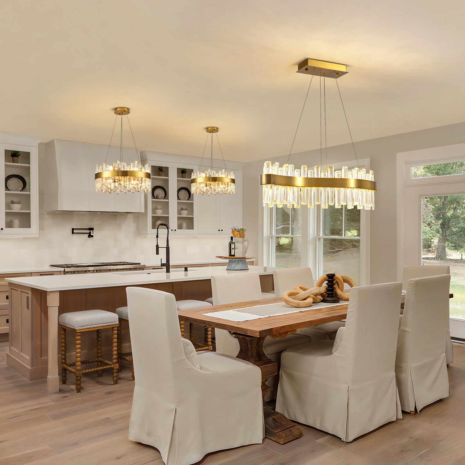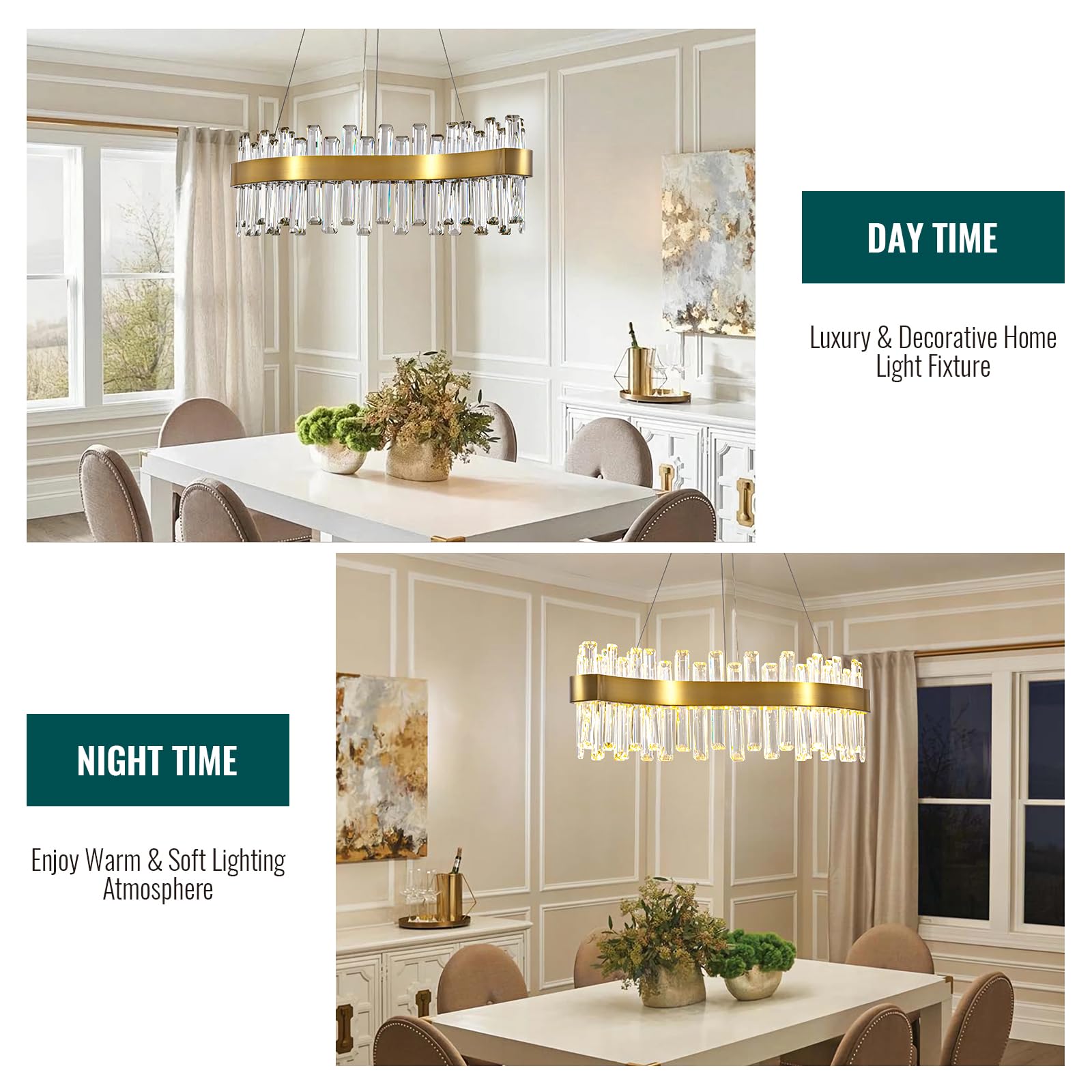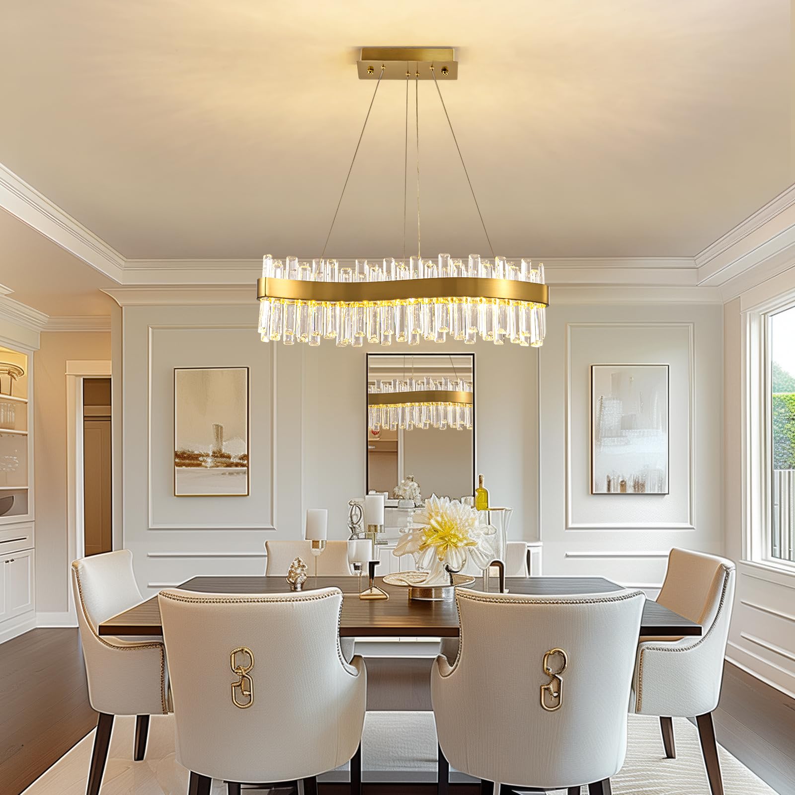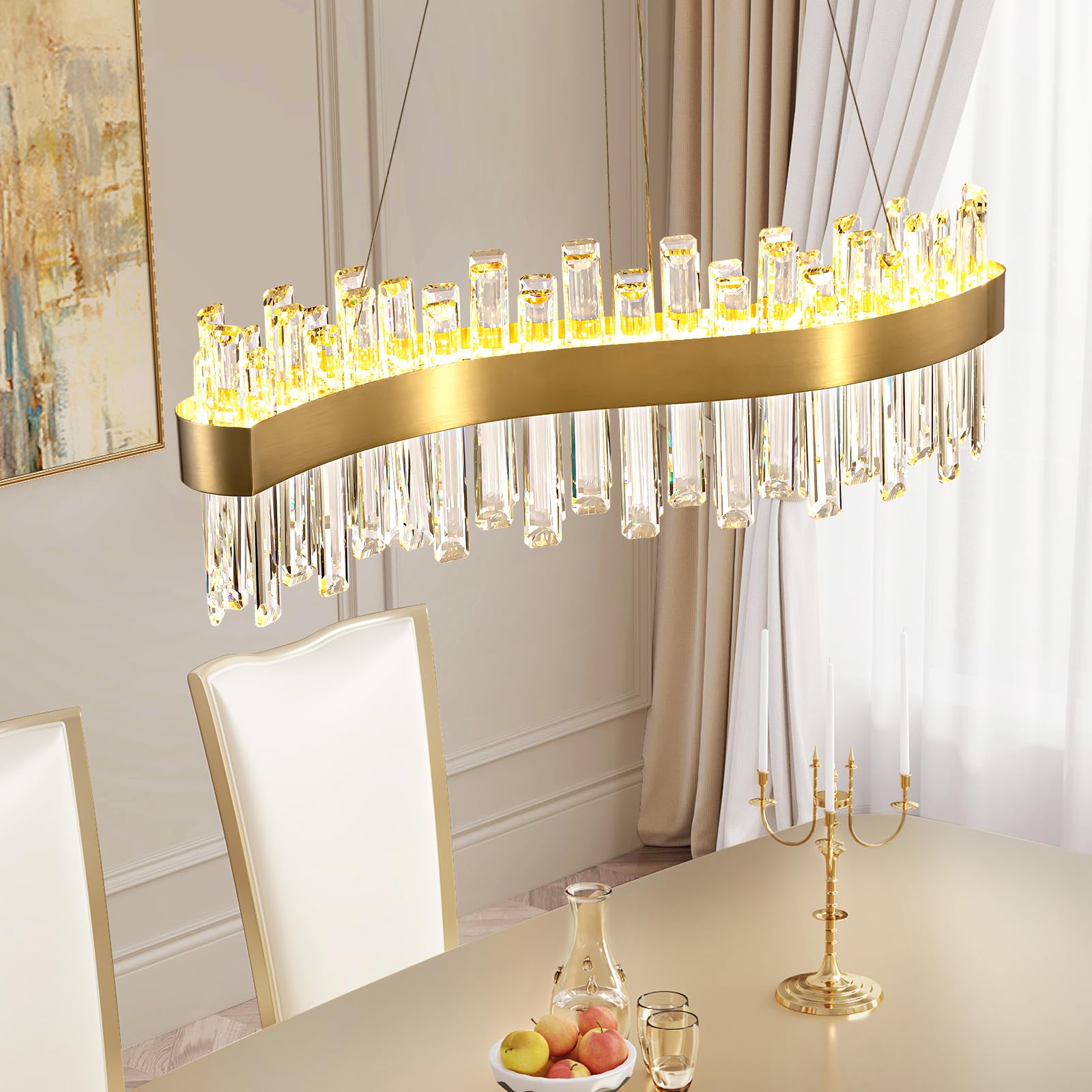 - This brass gold crystal chandelier consists of a unique s-shape brass gold lamp body which adorned with 2 tiers sparkling K9 crystals. It adds a touch of grandeur and serves as a captivating focal point to any space. Suitable for dining room, living room, kitchen island, home office, bedroom, etc.