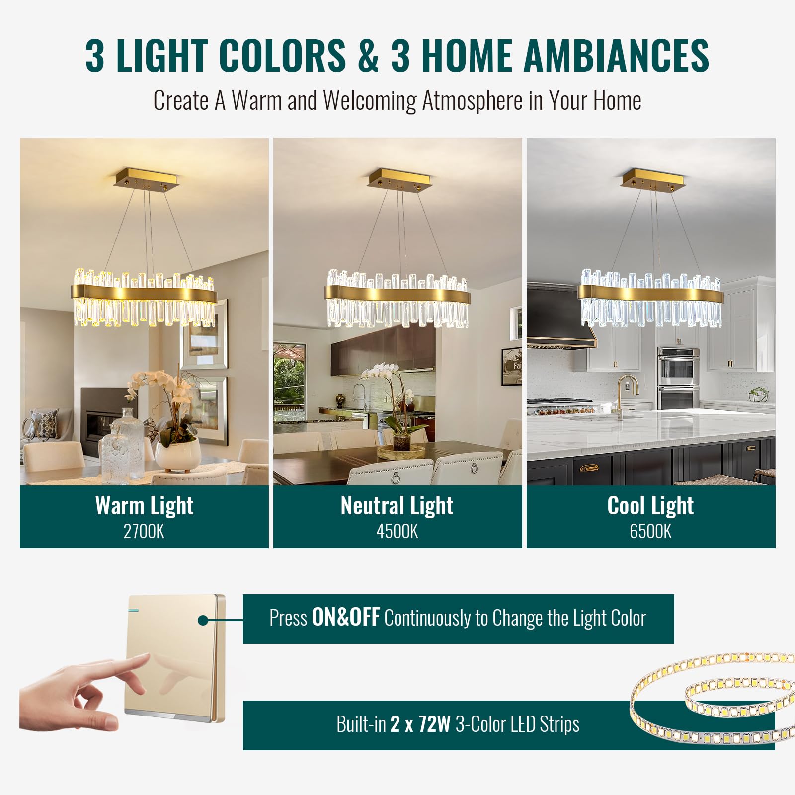 - Built-in 3-color 72W LED panel. You can change the light color from warm light(2700K) - cool light(6000K) - neutral light(4500K), creating different home ambiances for different occasions. Fully dimmable when used with a compatible dimmer switch, not included.
