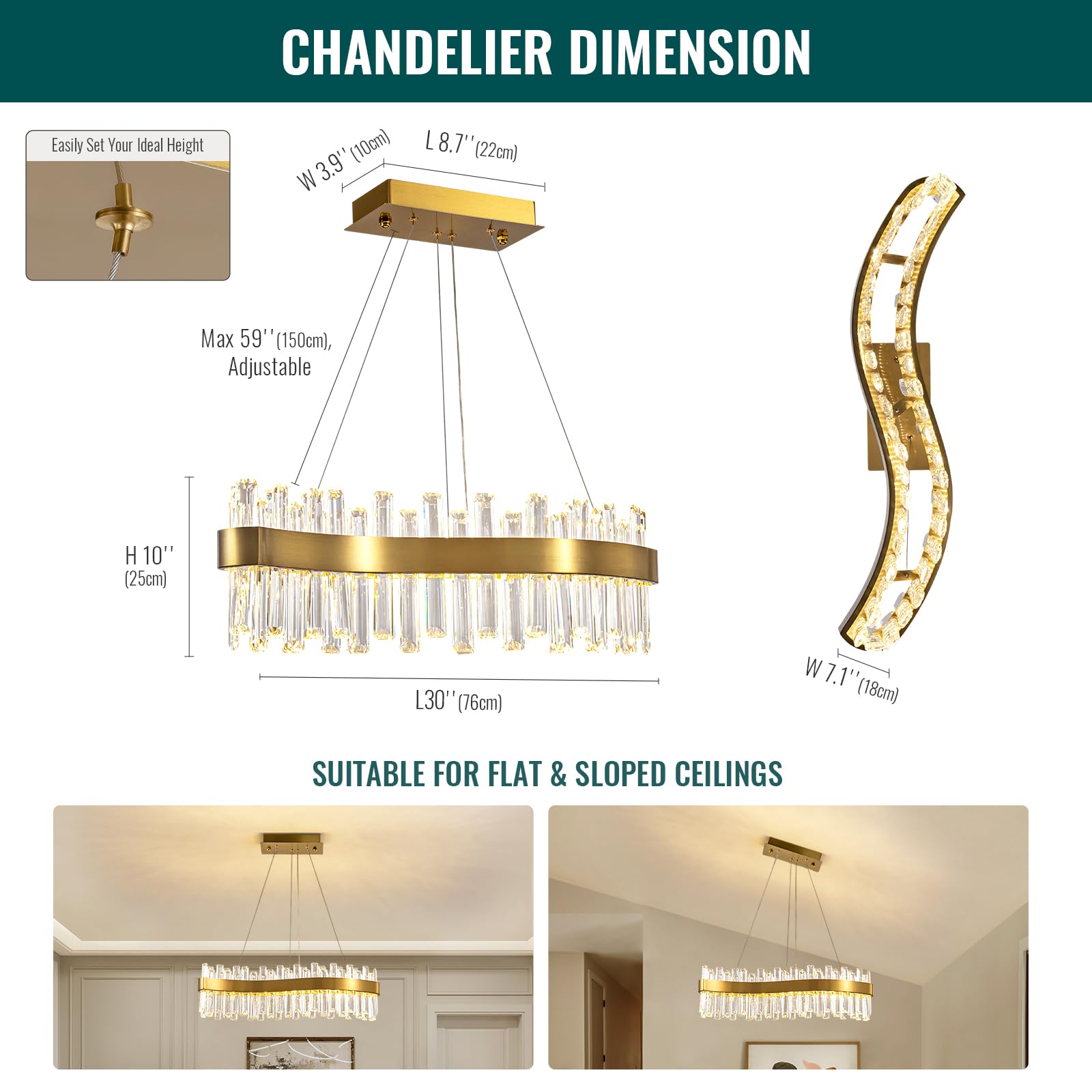 - L30’’(76cm) x W7.1’’(18cm) x H10’’(25cm). Stainless steel cables: Max 59’’(150cm), adjustable. Suitable for flat & sloped ceilings. Space room fit: 107-215 square feet. Longer cables for higher ceiling can be sent if needed.
