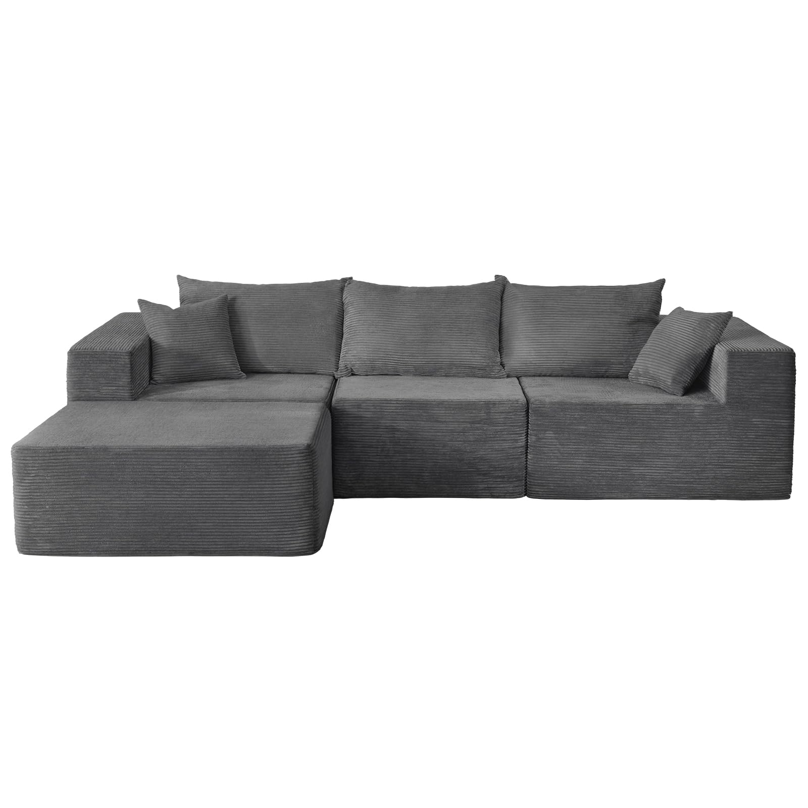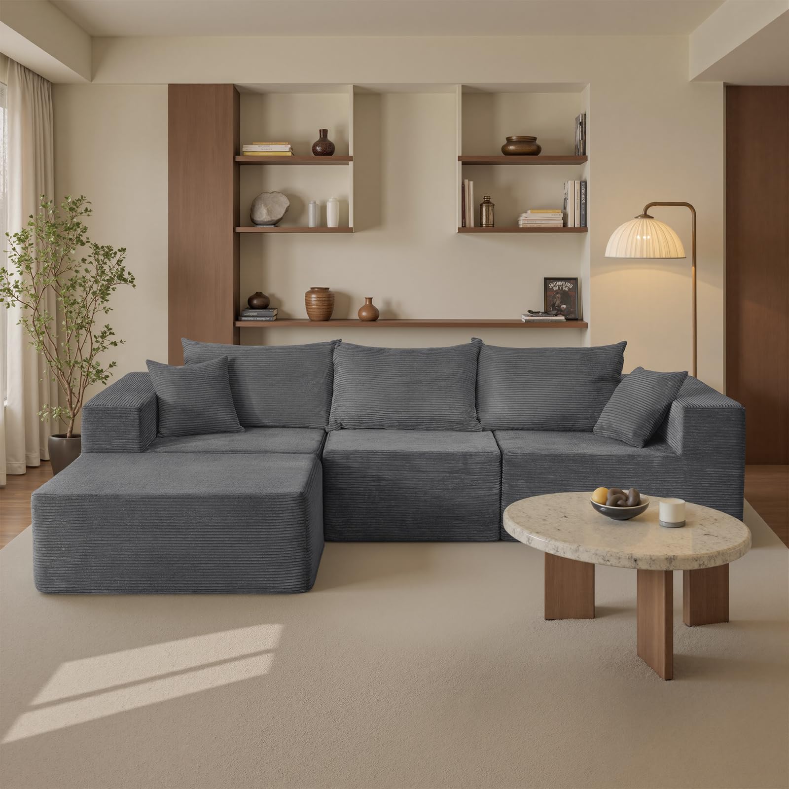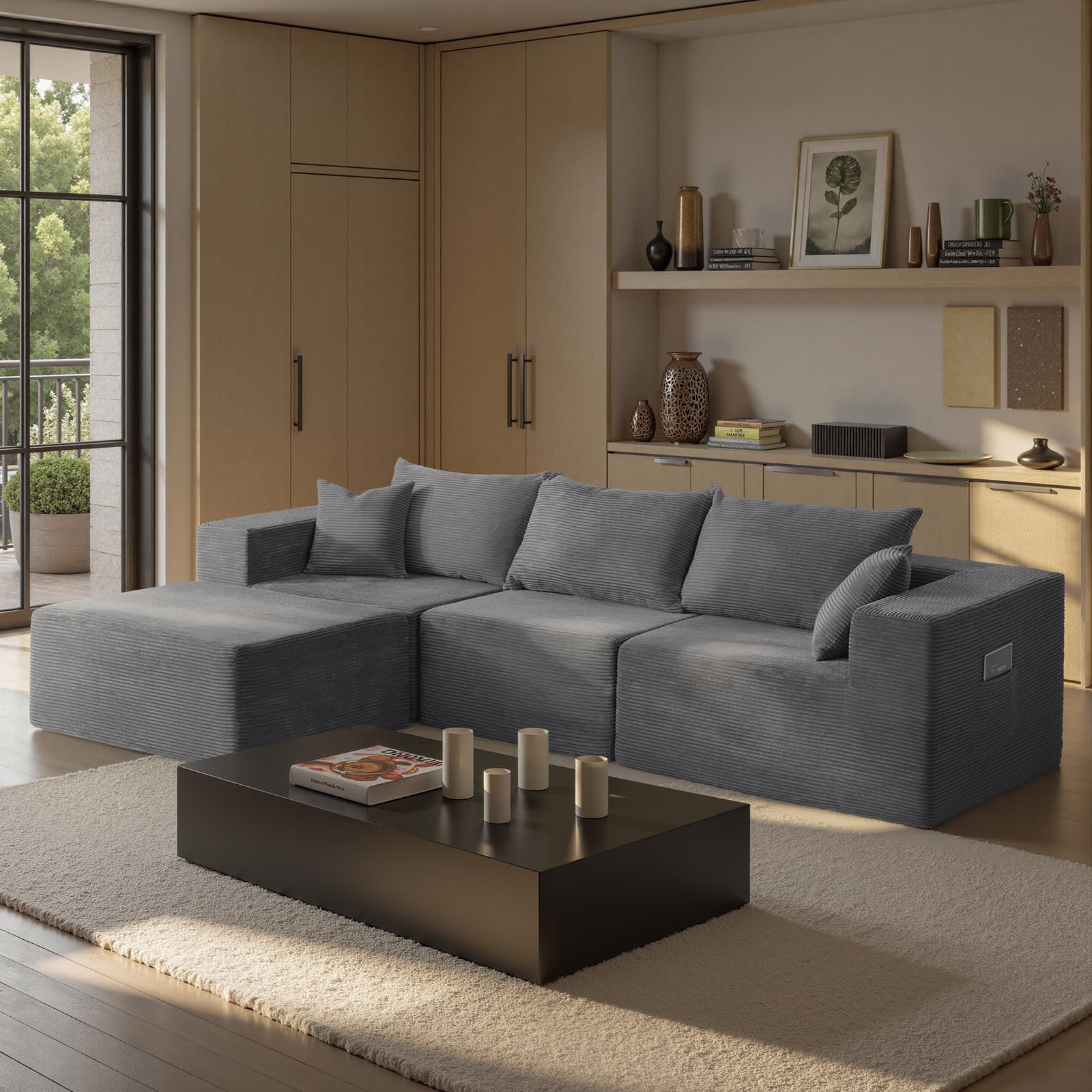 109" Modular Gray Corduroy Sofa with Side Pocket – Space-Saving Sectional Couch