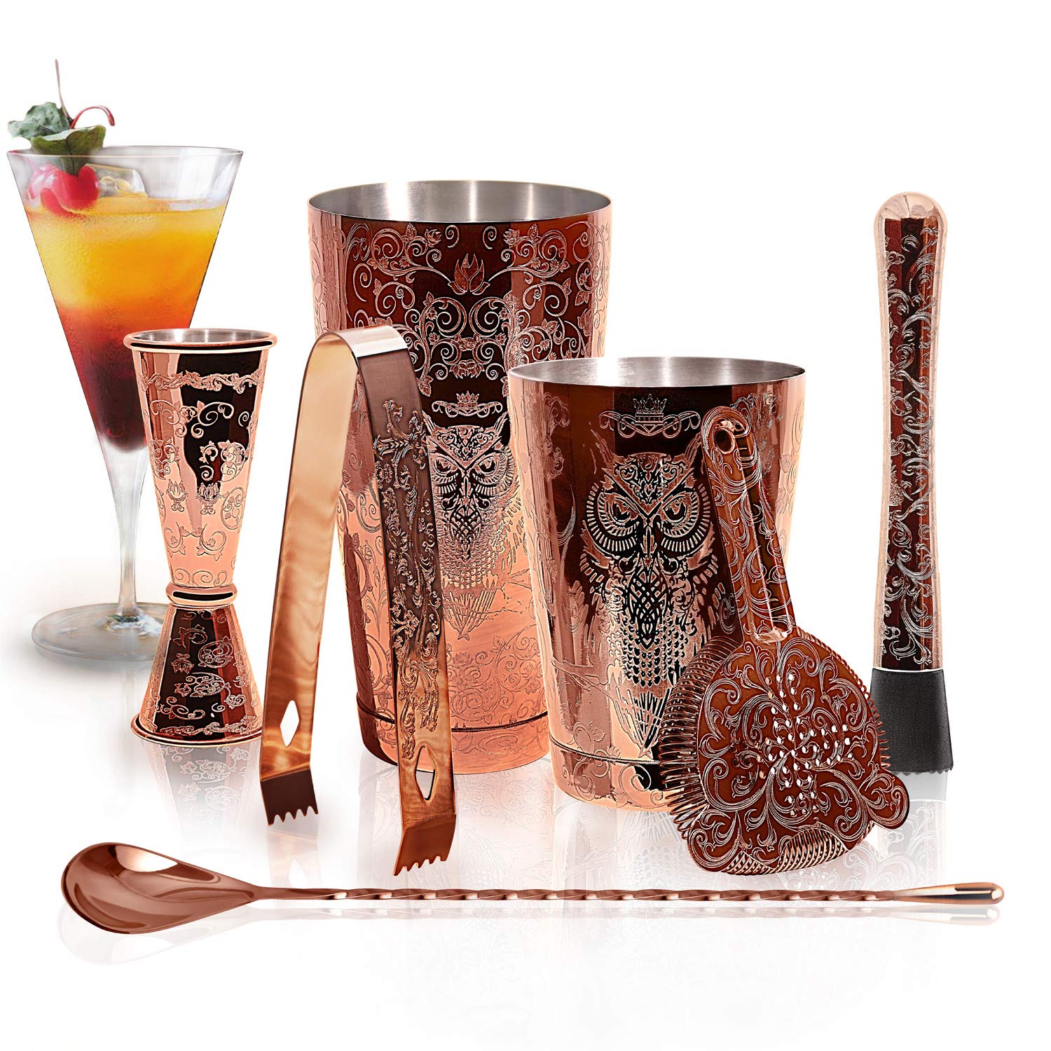 - The elegance of the bartender kit and its premium quality stainless steel just shines out with perfect grace and will add royalty to your kitchen. It has the classic delicate engravings from ancient times. Only a bartender set like this can match the nobility and stature. The copper colored boston shaker set talk of complete royalty and noble class.