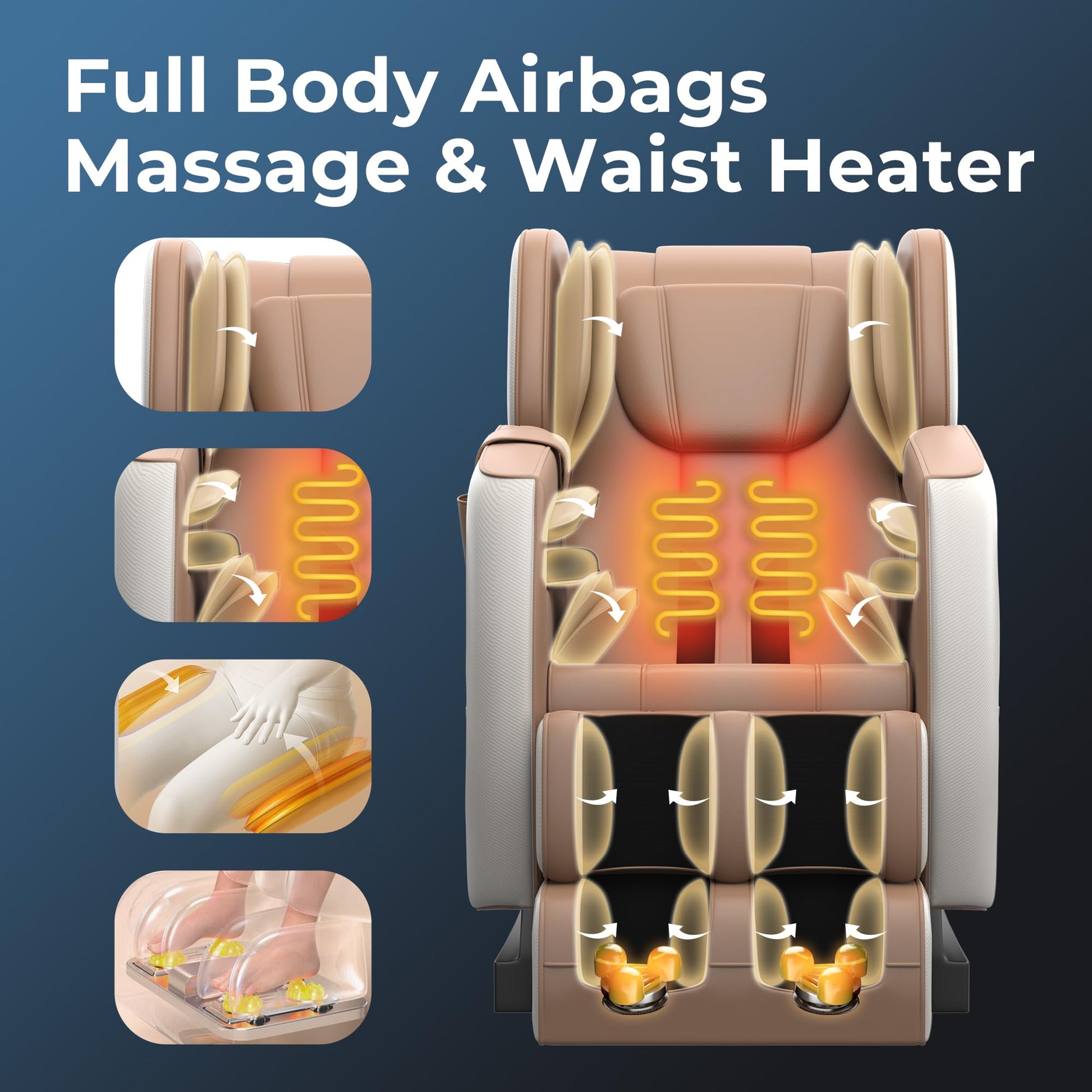 - Full Body Massage Chair: Massage Airbags cover shoulders, hands, hips, calves and feet. Kneads massage from head to feet, make you enjoy full body relaxation.
