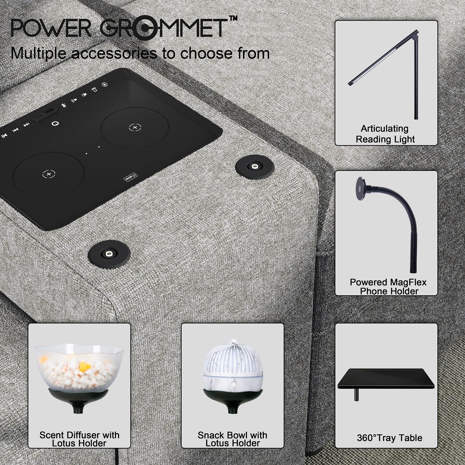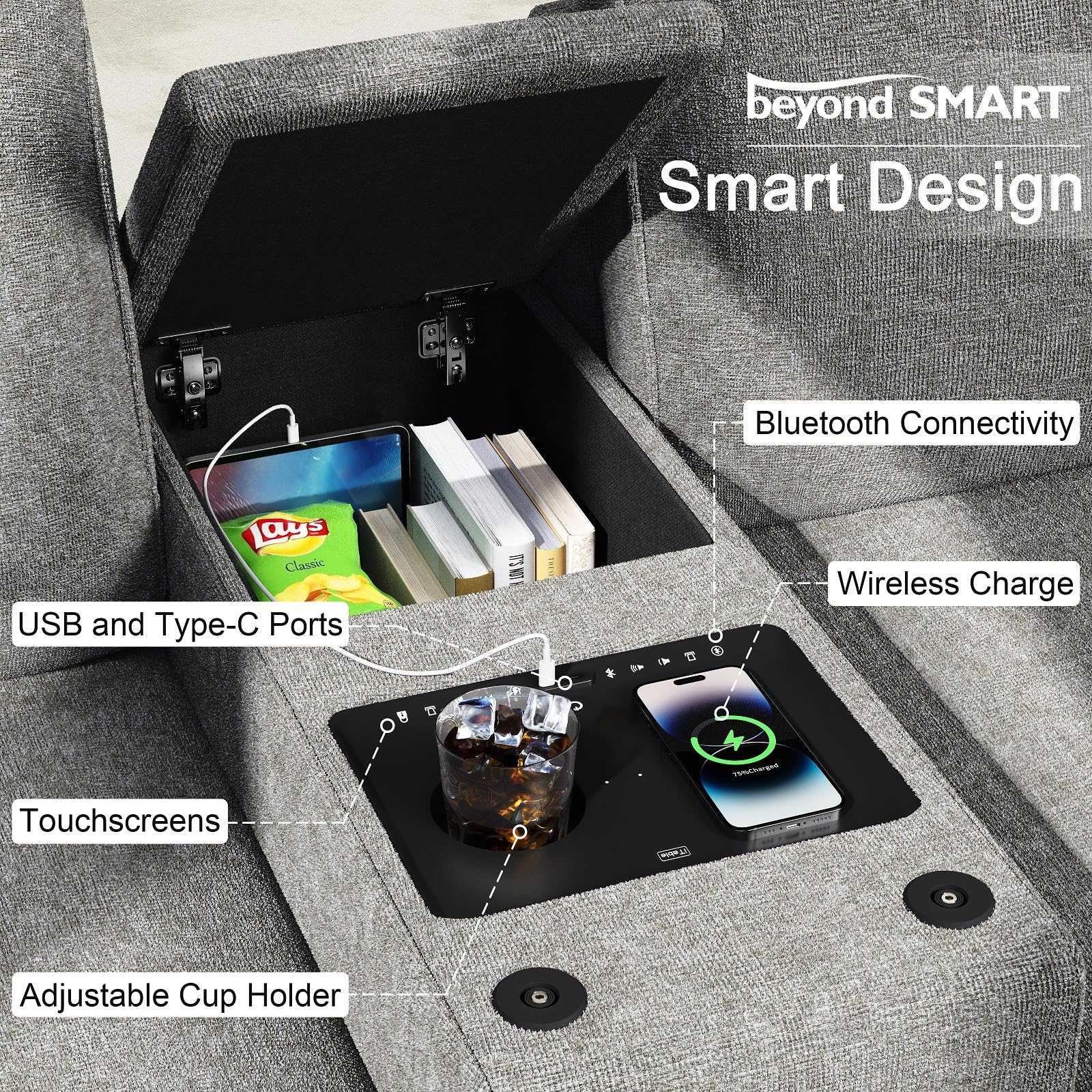 - Integrated Storage & Cup Holders: Flip-up armrests reveal hidden compartments. Convenient trays and cup holders keep everything within reach.