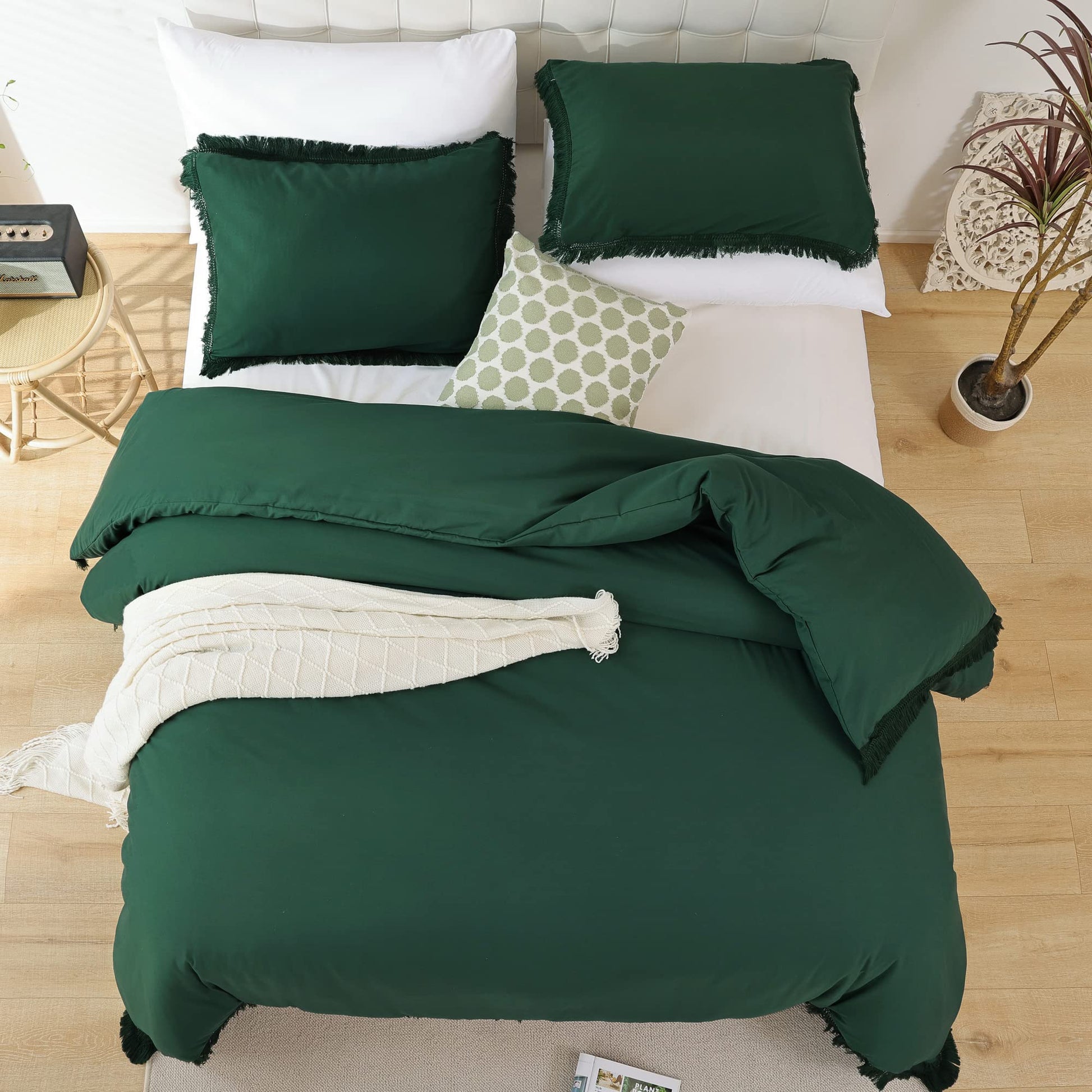 Queen Comforter Set Emerald Green 3Pcs Tassel Boho Bohemian Cute Soft Tufted Microfiber