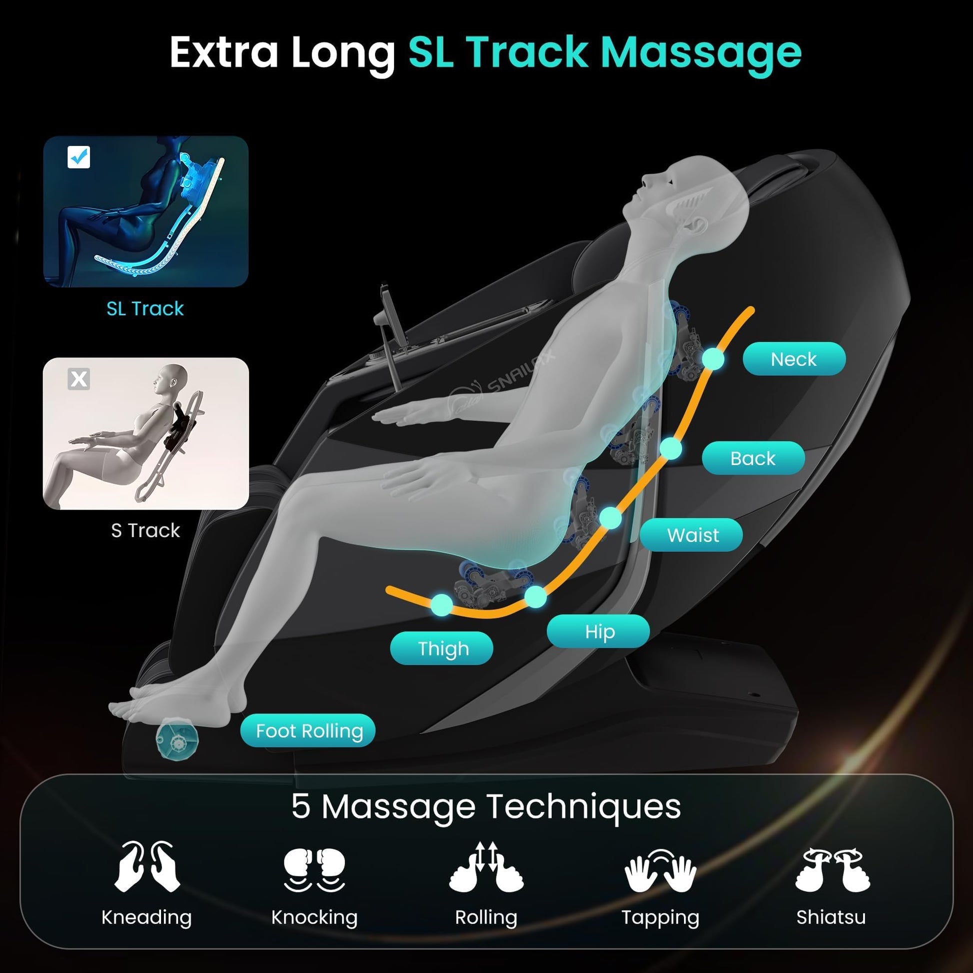 - Extra Long SL track Design to Fit Body Curve Snailax deluxe massage chair recliner features an ergonomically designed SL track. The deep tissue kneading massage will follow along the SL track, intelligently providing a massage that perfectly fits the curves of the human body, and the SL track helps to alleviate muscle spine soreness and tension. With a massage stroke length of up to 54 inches, it offers an extensive coverage to ensure a comprehensive massage experience.