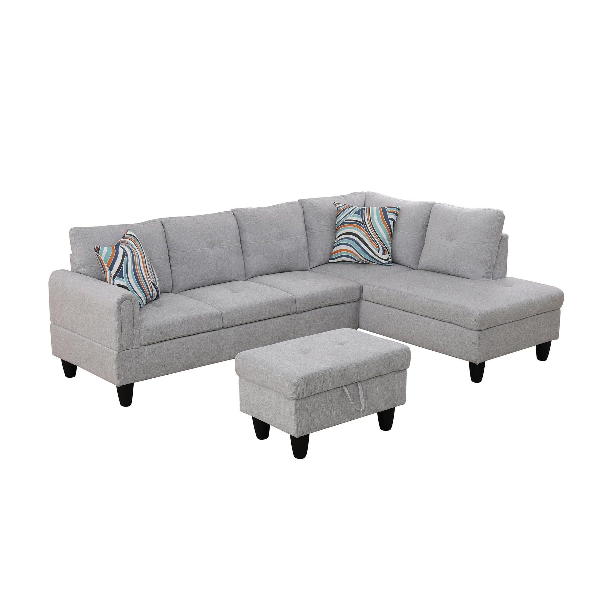 - Flexible Sizing: This set includes a chaise, sofa, and ottoman, each meticulously designed to fit seamlessly into various room sizes. The sofa and chaise measure 66.5"x30.5"x33.5" inches, while the ottoman measures 28.5"x19"x17.5" inches, offering versatility to complement your living space. Upgrade your home with this stylish and comfortable L-shaped sofa today.