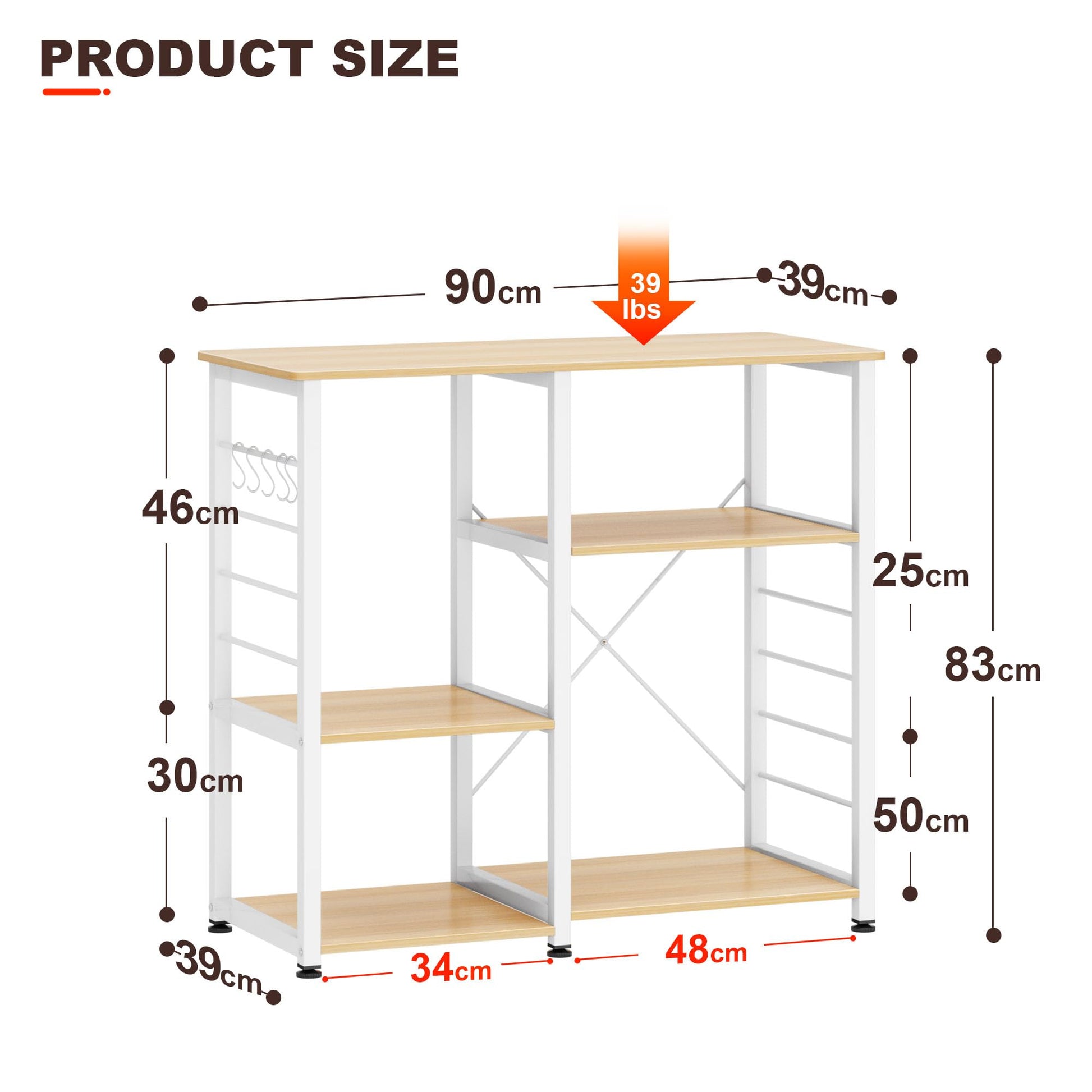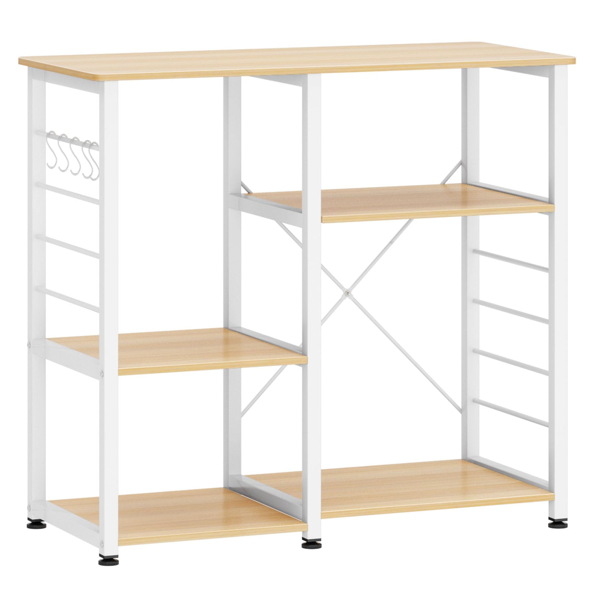 - Ample Kitche Bakers Rack The kitchen baker's rack is a practical storage workstation with five tier shelves and one pull-out wire basket. You can place a microwave or other kitchen appliances on the sturdy top shelf, and store toasters, spices, dishes, and other items on the remaining shelves and basket. You can place a microwave or other kitchen appliances on the sturdy top shelf, and store toasters, spices, dishes, and other items on the remaining shelves and basket. Additionally, the removable five S-shaped hooks can be used to hang cooking tools such as spoons, pans, or whisks, allowing for neat organization of your kitchen essentials.