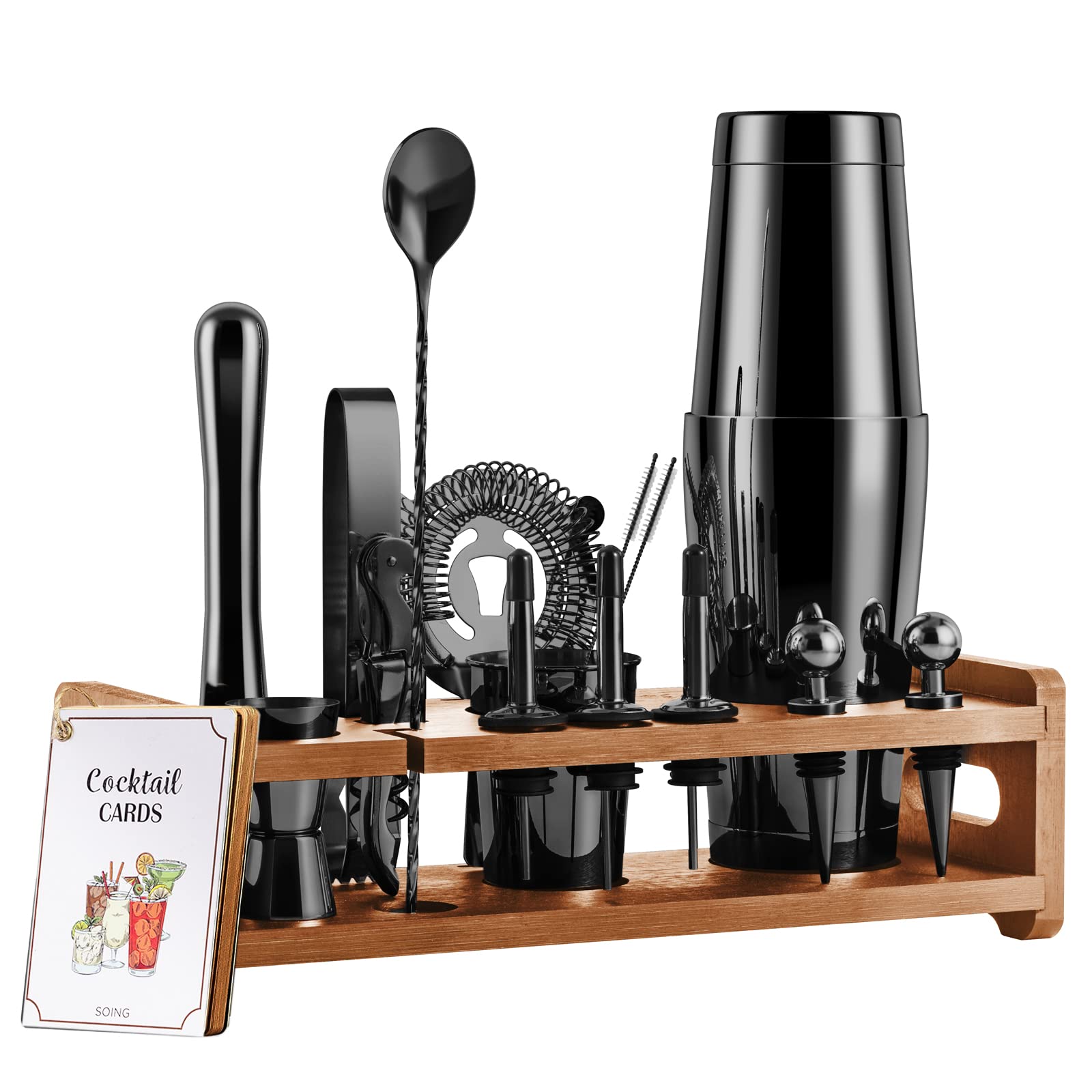 - A COMPLETE SET FOR MIXING - 24-Piece bar tools set of high quality bartending accessories.With our special recipes booklet,no matter if you have ever made cocktails by yourself,you could now try it without hesitation!Soing 24-Piece bartender kit would always be a good choice!Time to share your own drink with your friends and family!