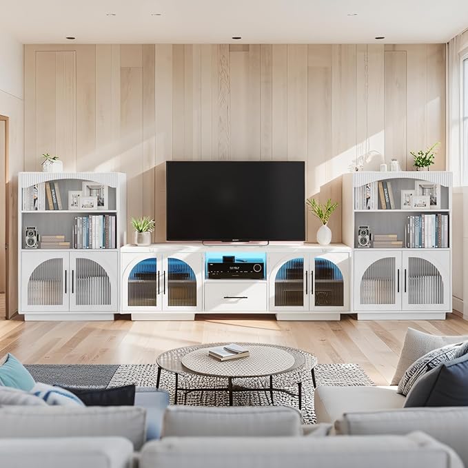 70" TV Stand for 80 Inch TVs, Entertainment Center with LED Lights and Arched Glass Doors