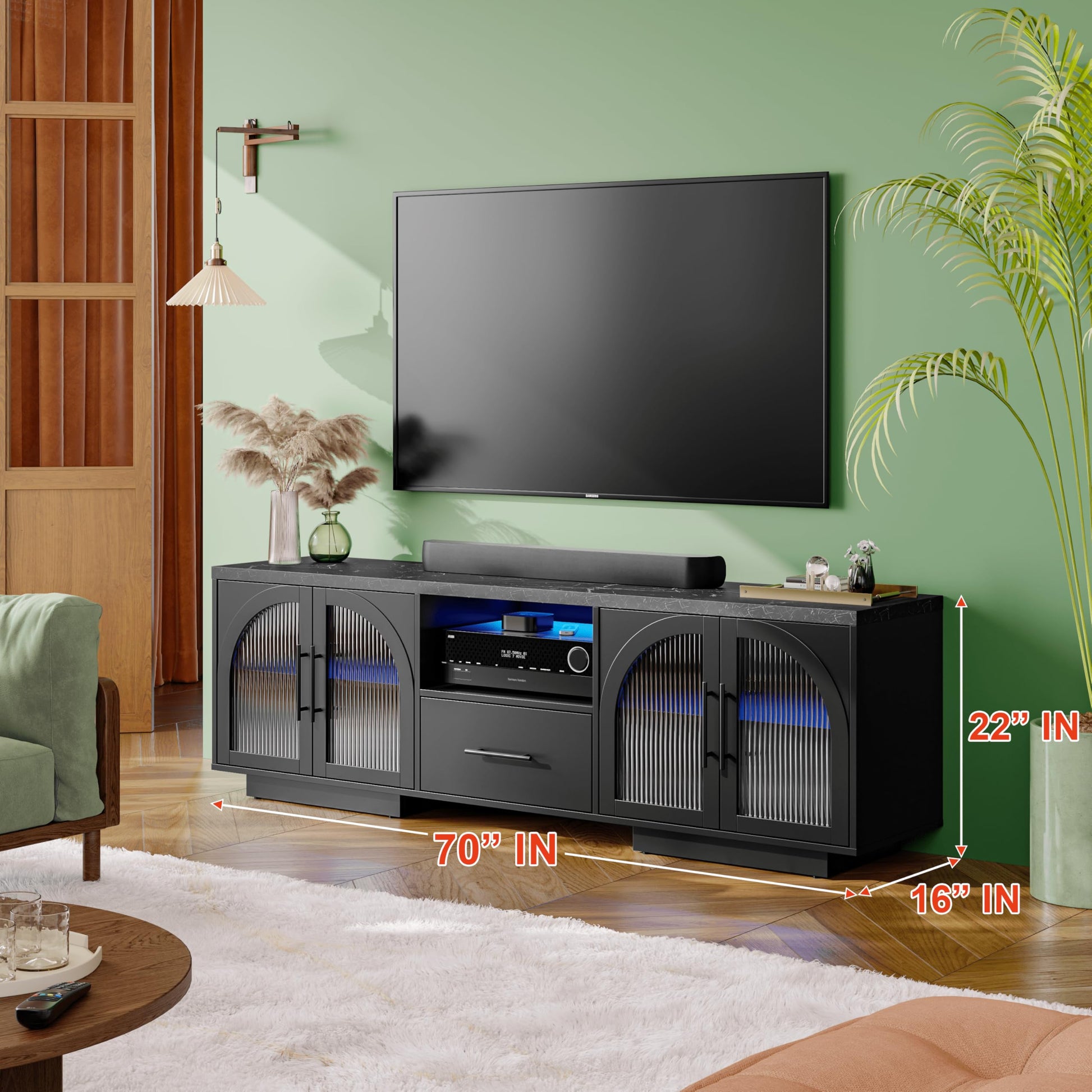 - Featuring arched fluted glass doors, this TV stand embodies a timeless mid-century modern design that adds sophistication and elegance to any living room or entertainment space.