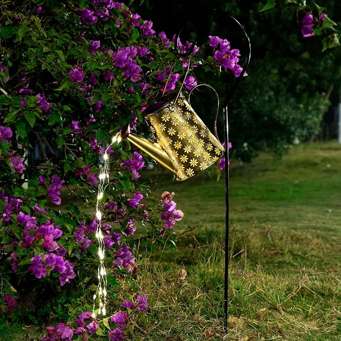 - Creative Garden LED Lights:Outdoor solar Lights has a unique and decorative design, can be hung on the porch, tree, or pergola with a hanging ring, or placed on the table or ledge to display a vivid and pretty retro hollow pattern, add a warm and pleasant ambience to your yard and deck.Copper wire LED lights can be easily bent and shaped into any shape you like. Choose a special spot in your garden or yard to hang the watering can with lights that appear to be pouring water.