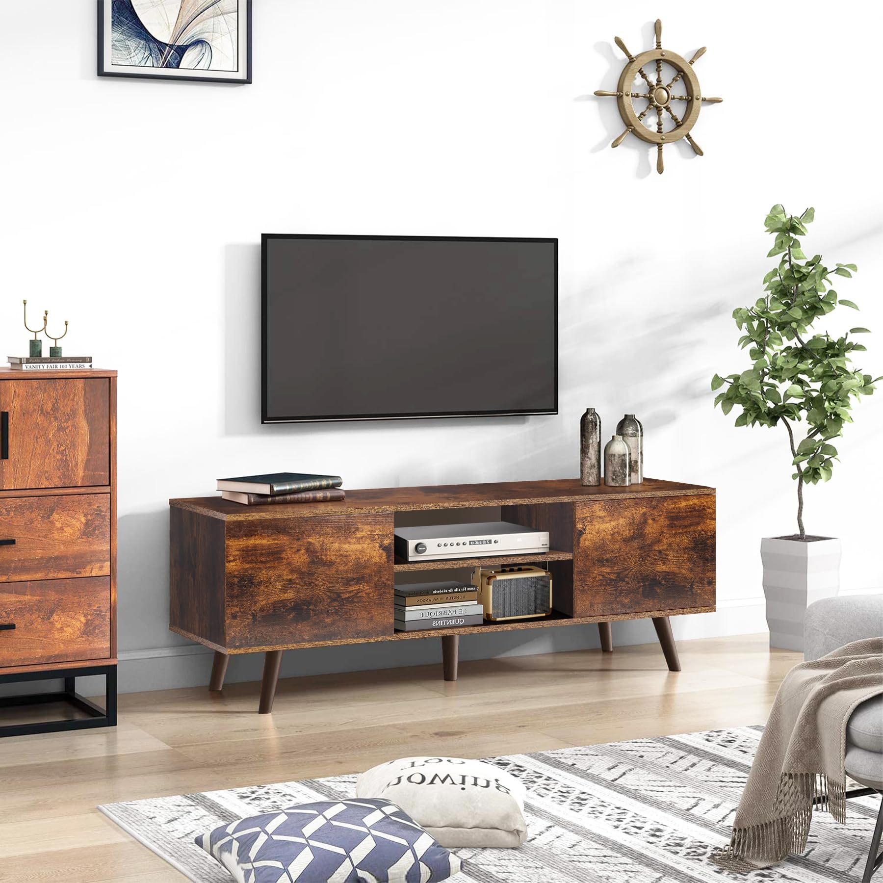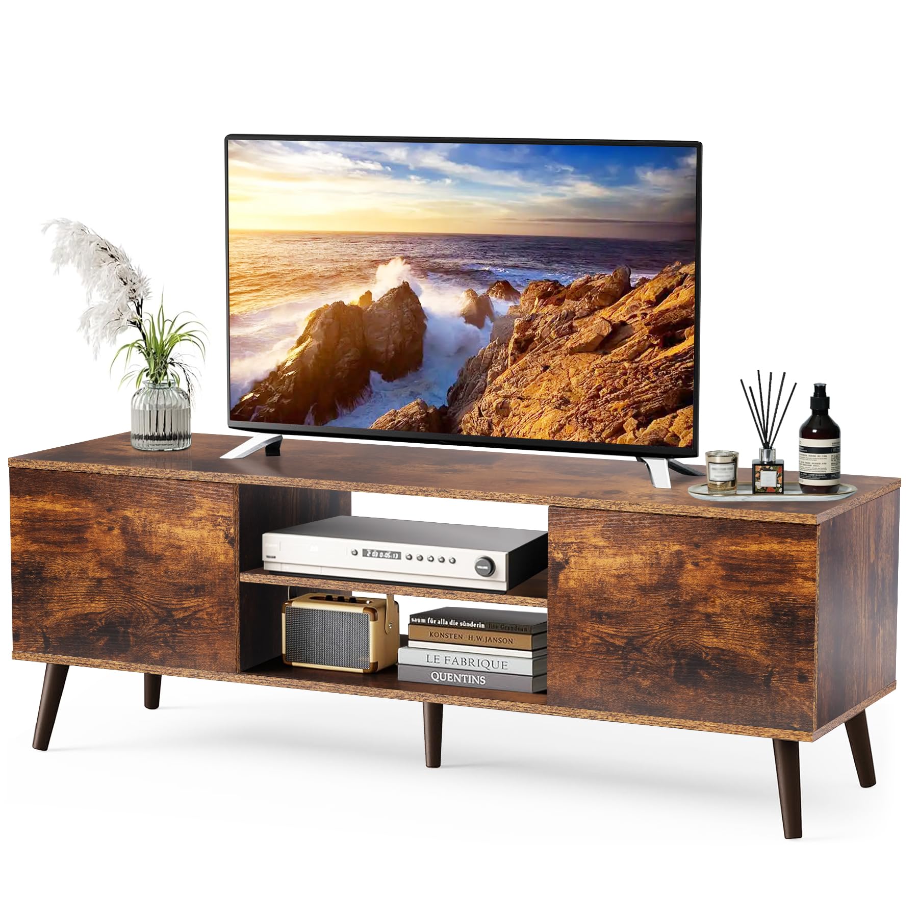 Stand for 55 60 Inch TV, Retro Brown Wood Television Stand 2 Cabinet Modern Entertainment Center with Storage for Bedroom, Living Room, Office Furniture