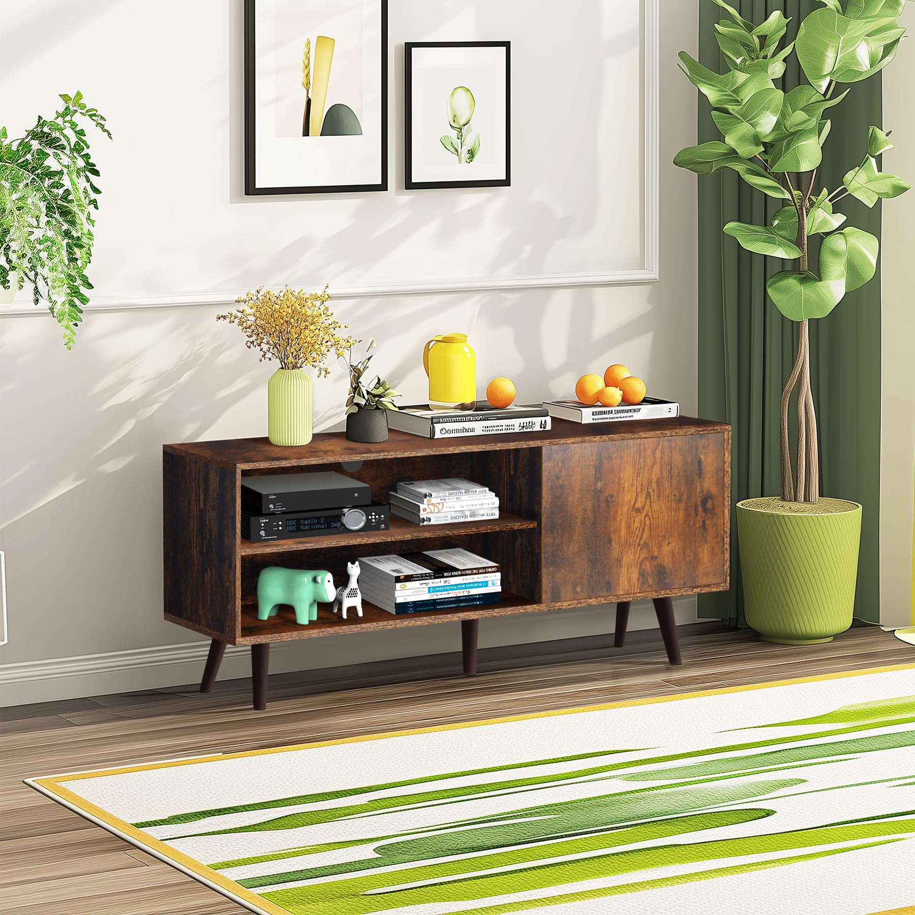 55 Inch TV, Retro Brown Wood Television Stand 1 Cabinet Modern Entertainment Center