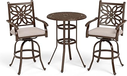 - Premium Material: The patio bar height table and swivel chairs are made of highquality aluminum and aluminum alloy using traditional cast aluminum technology, this patio bar set is both beautiful and elegant. The natural alumina protective film on the surface of cast aluminum provides excellent rust and water resistant, while the special powdercoating process further strengthens its performance