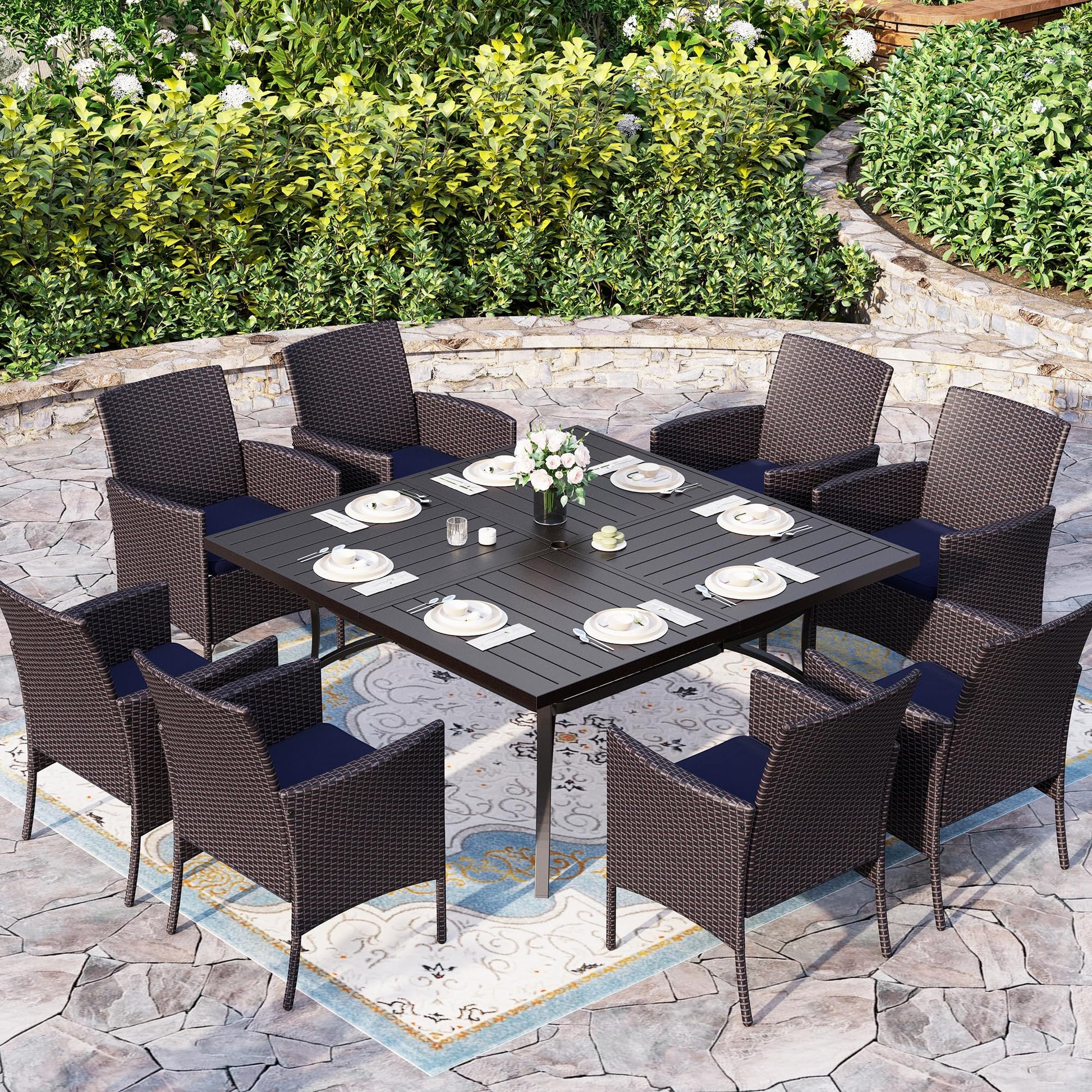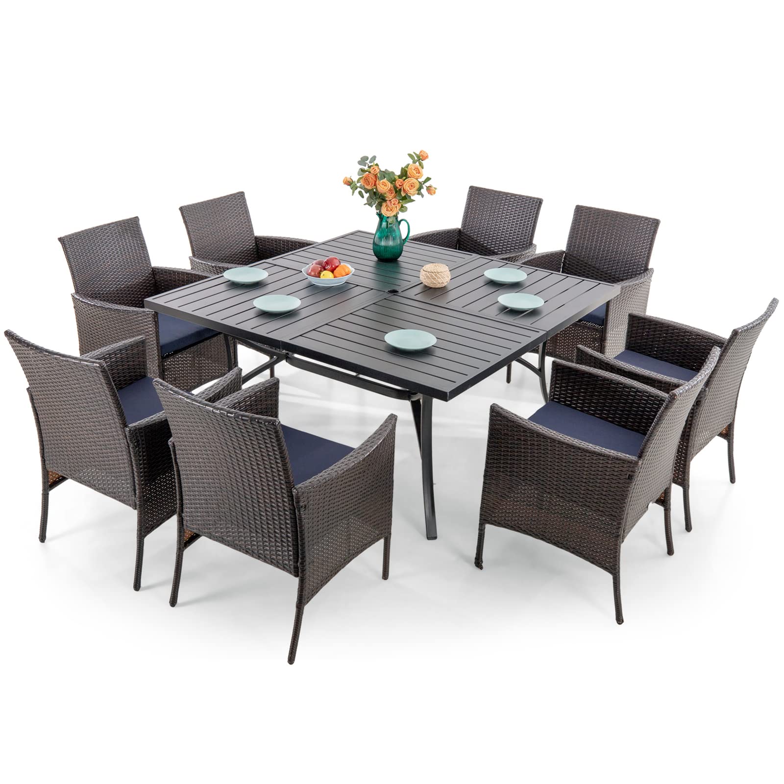 9 Pieces Patio Dining Set for 8, All Weather Square Metal Patio Table and Wicker Chairs