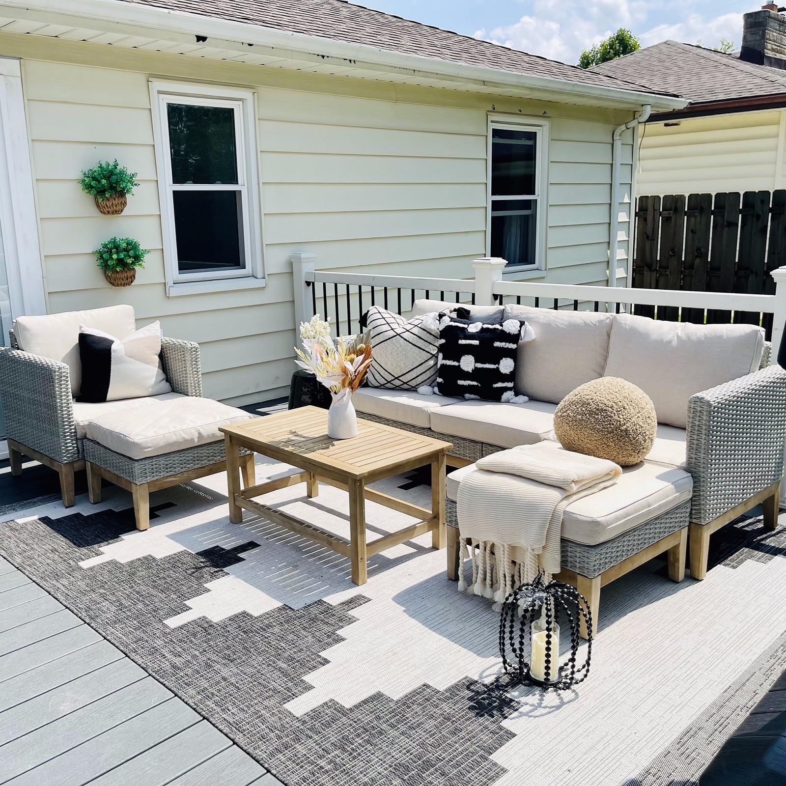 - All-Weather Wicker: The patio furniture set is crafted with durable PE rattan that are strong enough to withstand all weather variations and won't fade, split or incur other wear. The wicker armrests design to avoid the metal making the hands cold in winter and hot in summer