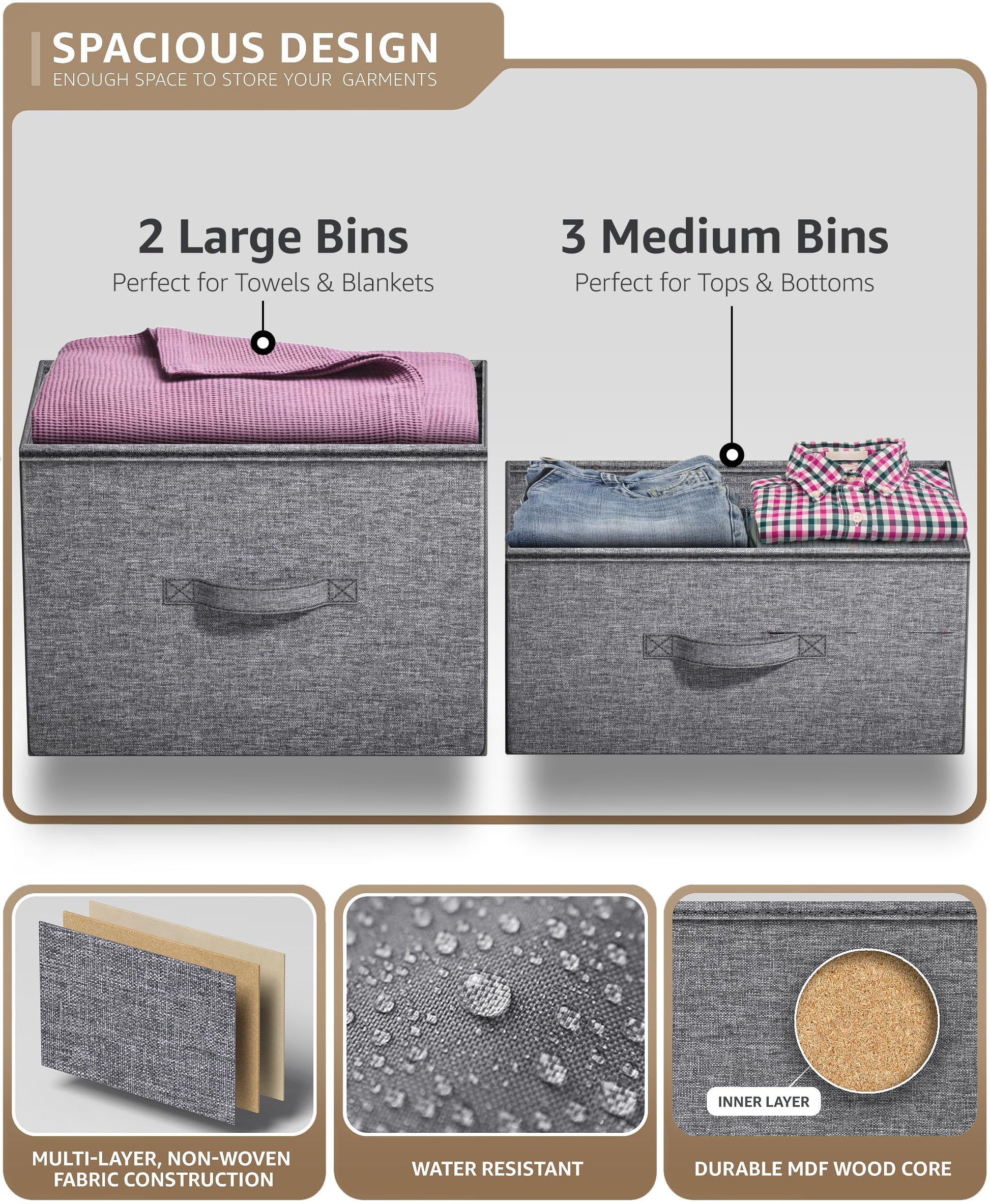 - Easy Assembly: No tools necessary! Put this dresser organizer together in minutes - Hardware and instructions included -Supports up to 65 lbs - Dresser measures approximately 27.25 H 33.5 L 11.75W Medium bins measure 15.16 x 11 x 7.68 in Large bins measure 15.16 x 11 x 11.61 in