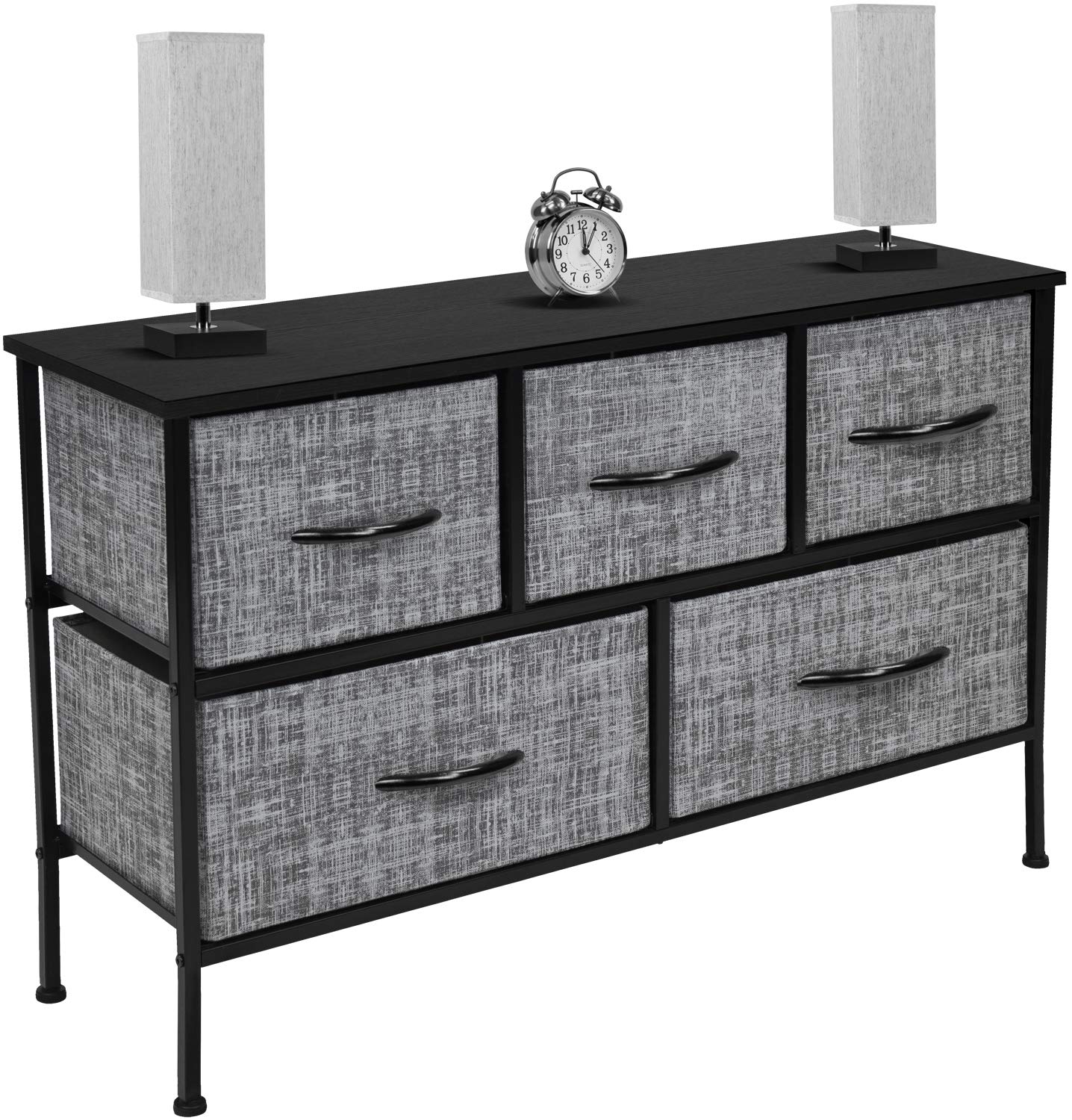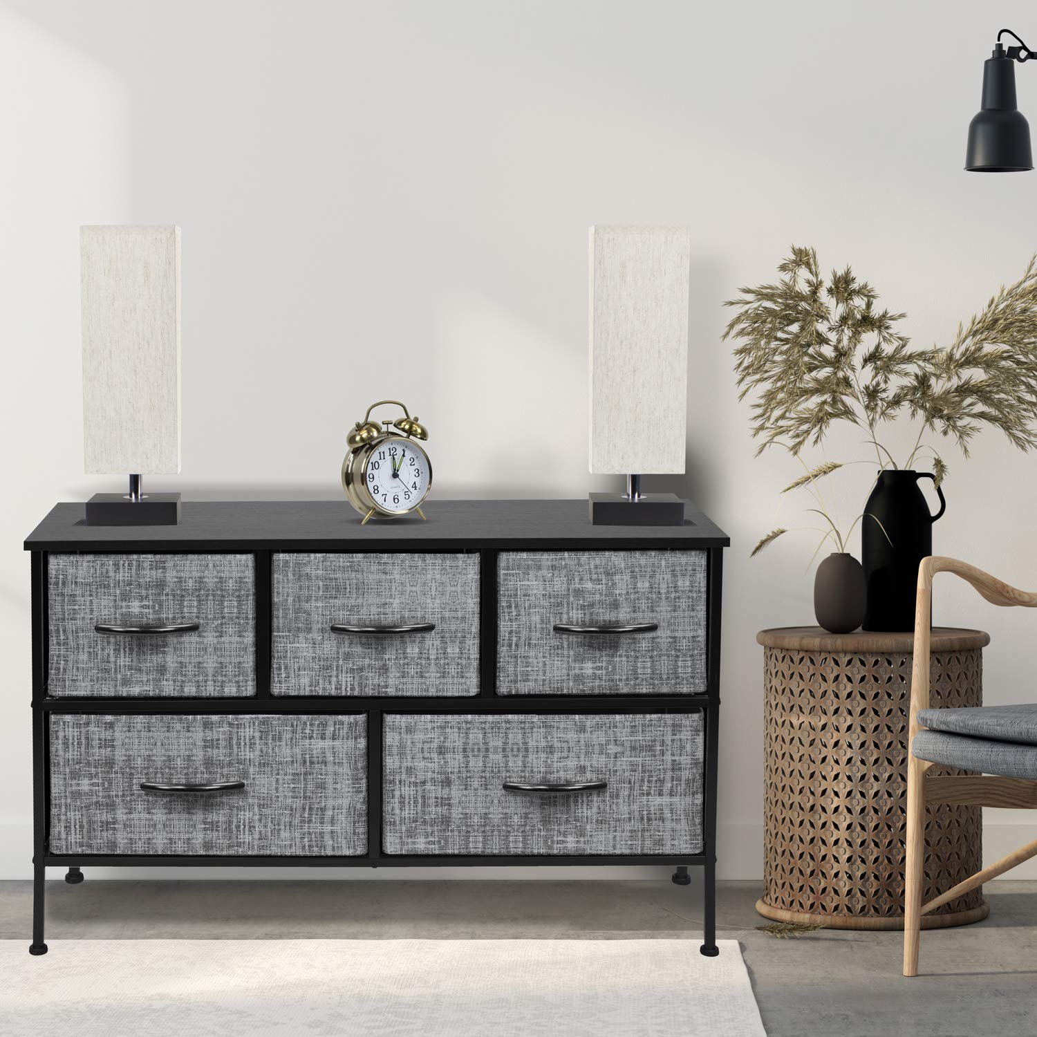 - SPACIOUS STORAGE: This long bedroom dresser features 5 fabric drawers, offering large storage space for nighttime necessities - Each drawer is approximately 8.45 inches deep - The MDF wood top features a smooth beige finish - Ideal for displaying a TV, alarm clock, phone, charger, eyeglasses, and more