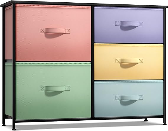 - KID FRIENDLY DESIGN — Sleek wide storage — Made with strong steel frame and durable MDF wood top with smooth white finish — Drawers made of breathable, non-woven fabric — Pastel colors in teal, yellow, peach, pink, aqua, purple — Wipe clean — Minimal assembly required — Hardware and instructions INCLUDED — Measures approximately 31.50” L x 11.75” W x 24.62” H