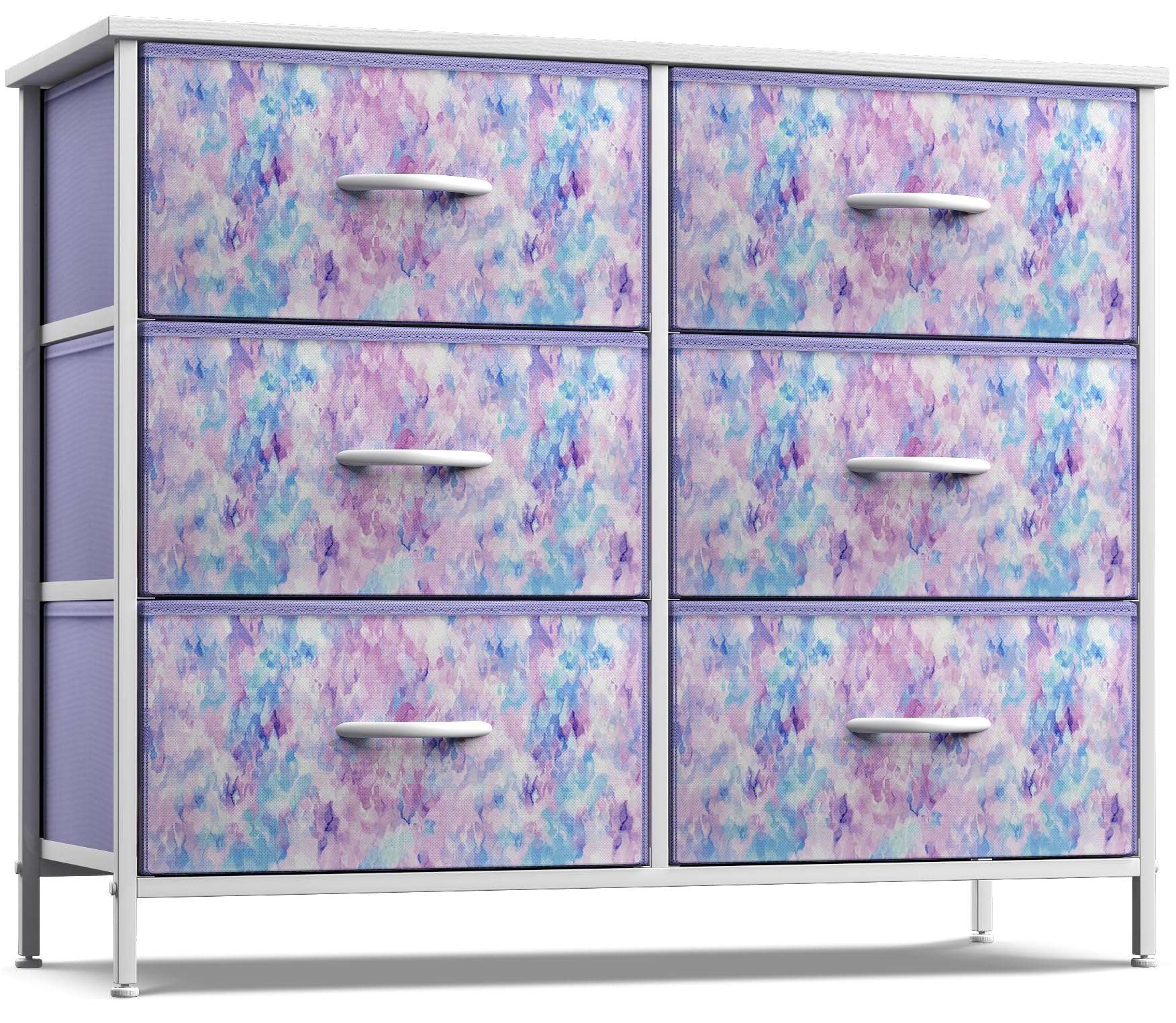 - 6-DRAWER DRESSER (TIE-DYE, BLUE/PINK/PURPLE) — Style meets function with this dresser chest, complete with wood surface and tie-dye print drawersDISPLAY & DE-CLUTTER — Wood top provides hard surface for displaying books, lamps, alarm clocks, electronics, and more — Drawers great for storing baby and kid clothes, blankets, linens, toys, plushies, accessories, knitting supplies, and household clutter