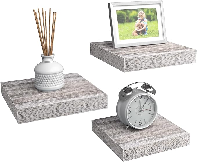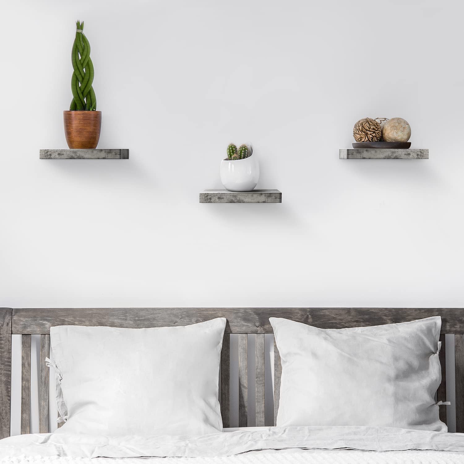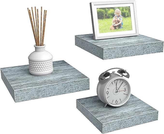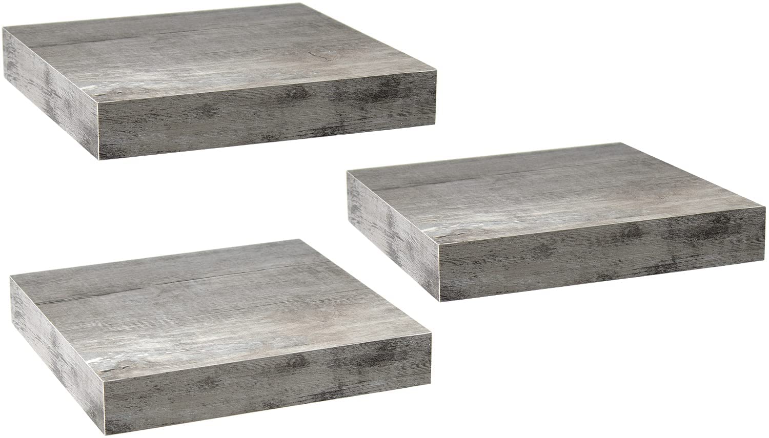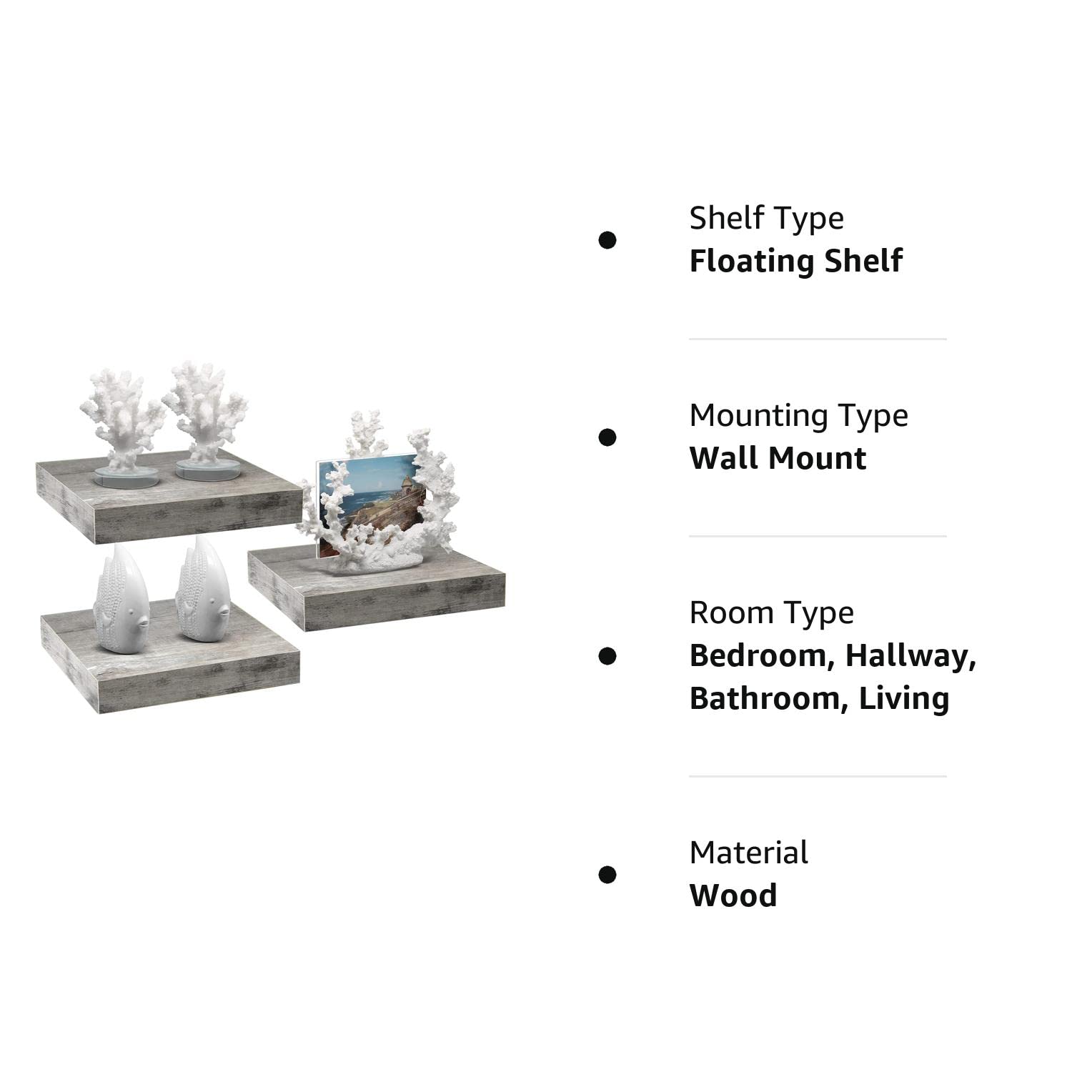 - Rustic Grey Floating Shelves for Wall: Set of 3 Rustic Grey Square wall shelves to Display charming showpieces, decorative items, plants, and prized possessions these shelves are used to showcase your personality while offering functional storage - Enhance bedroom wall decor and fill in empty wall spaces above a desk, fireplace, entryway, vanity, between windows - Measures approximately 9.25" X 9.25" 1.5 inches thick