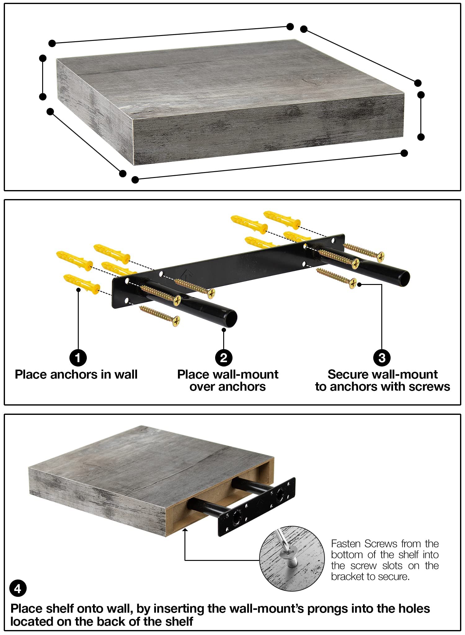 - Easy To Install Book Shelves: Our small Rustic Grey floating shelf is Made of beautiful faux wood engendered wood with a smooth matte finish NOT SOLID WOOD - Minor assembly is required and it Attaches firmly to the wall without visible support, All the Mounting Hardware is INCLUDED - Wipe clean with a dry cloth - Supports up to 8 pounds per shelf