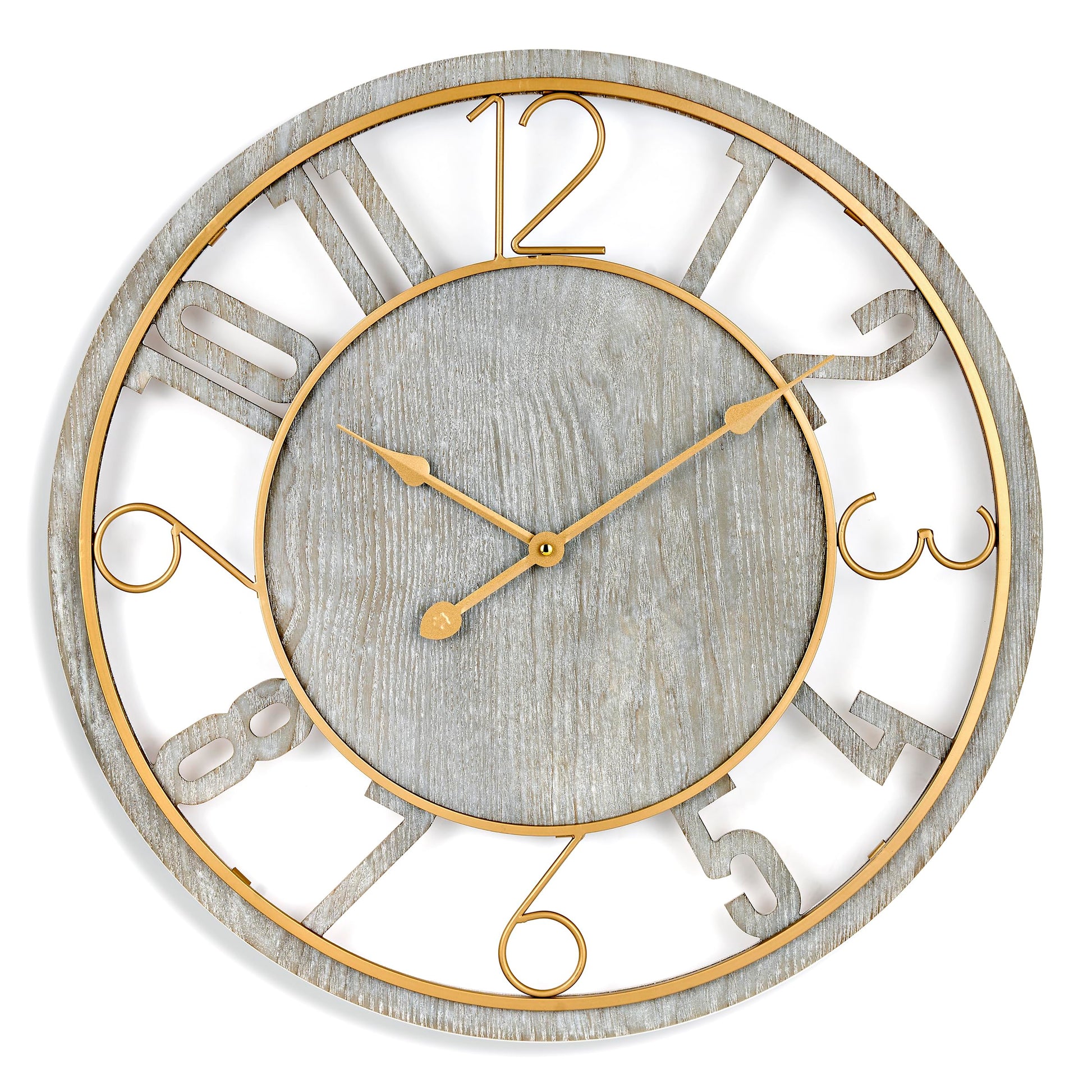 - Design Details: Stylish design features a combination of woodgrain and gold metal - Matches any furniture color - Analog time display - Wall clocks battery operated - Requires 1 AA battery (Not included) - Measures 24 inches round