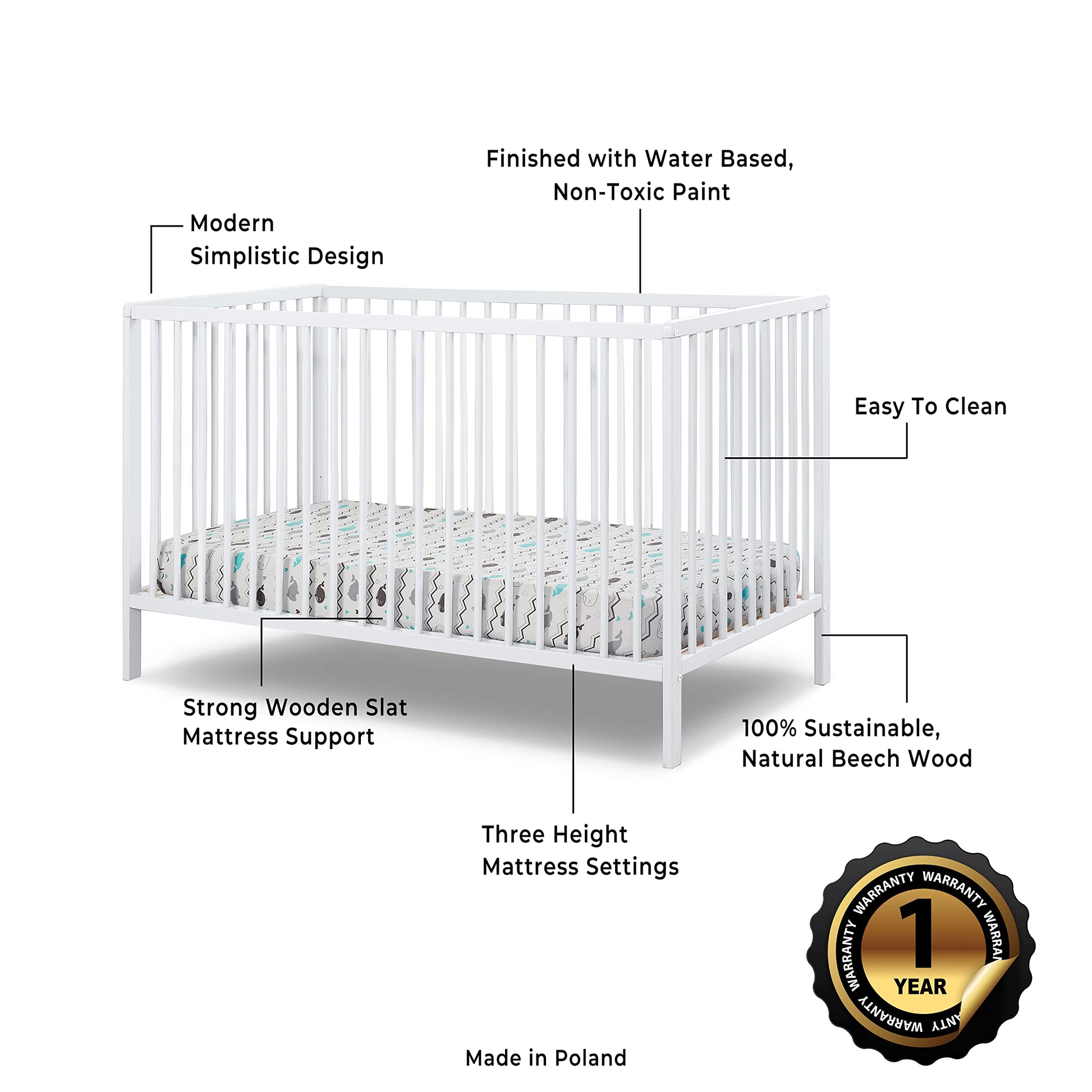 - SUSTANABLE CRAFTMANSHIP: This baby crib is made from durable, all-natural beechwood and a water-based paint that is easy to maintain and keep clean. Made with 100% non-toxic elements that are free from harmful materials/chemicals, the crib is easy to assemble and comes in a grey, black or a white wood finish.