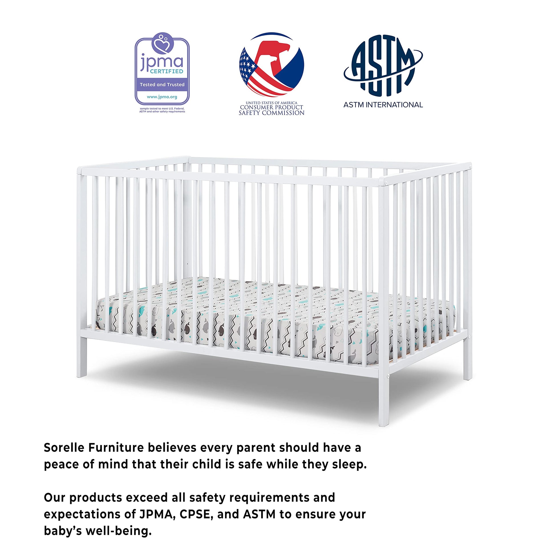 - SAFE FOR YOUR BABY: Our baby furniture is tested by 3rd party labs to meet and exceed all standards set in place by the Juvenile Products Manufacturers Association, Consumer Products Safety Commission, and the American Society for Testing and Materials. We believe every parent should have a peace of mind that their child is safe and sound while they sleep.