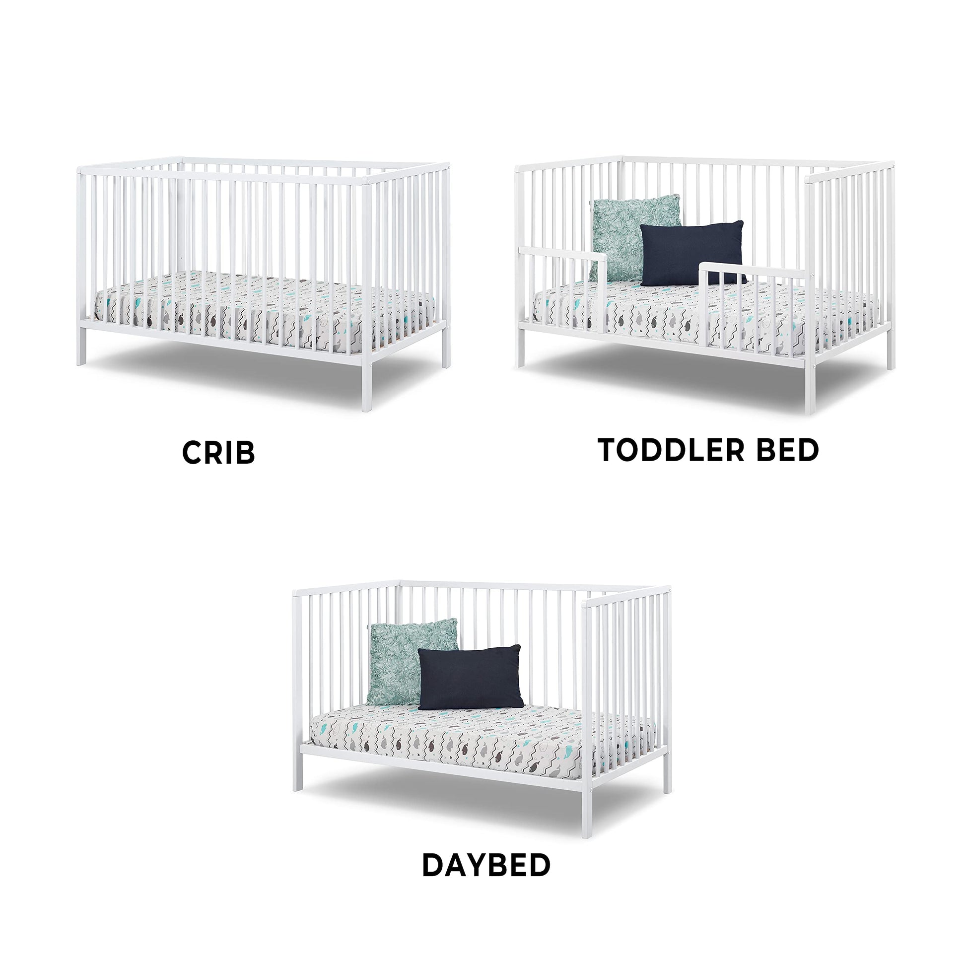 - 3-IN-1 CONVERTIBLE CRIB: Converts from a baby crib (baby mattress sold separately) to a toddler bed (child bed guardrail sold separately) and a kid’s daybed. The crib has adjustable child mattress support base with 3 different height options; designed under the guidelines of the CPSC and uses a standard size baby mattress.