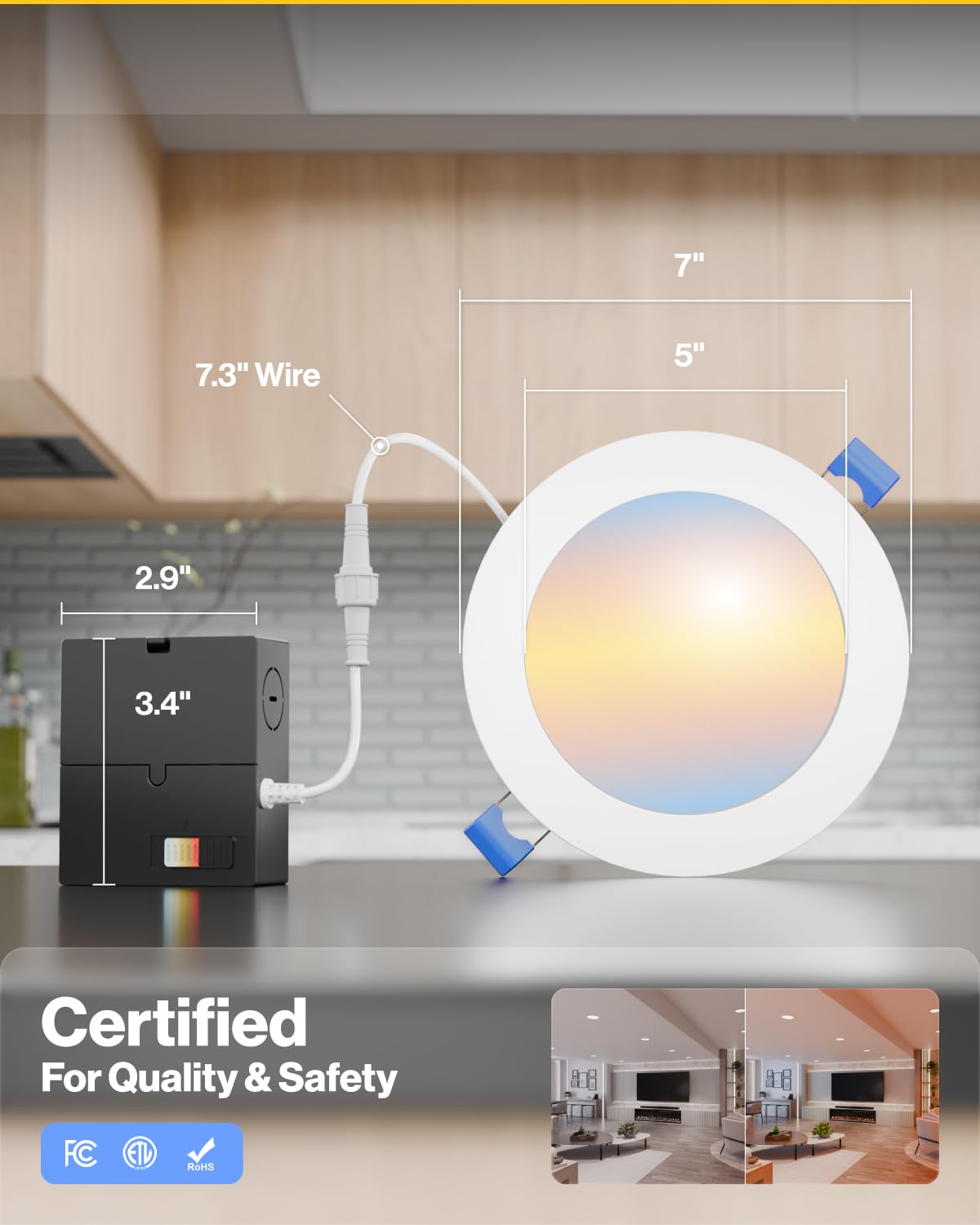 - 5-in-1 CCTs -Use the color temperature switch to tune the light to your preferred ambience (2700K, 3000K, 4000K, 5000K, 6000K). Try various color temperatures to suit the look and feel of your room, then lock in your selection during installation.