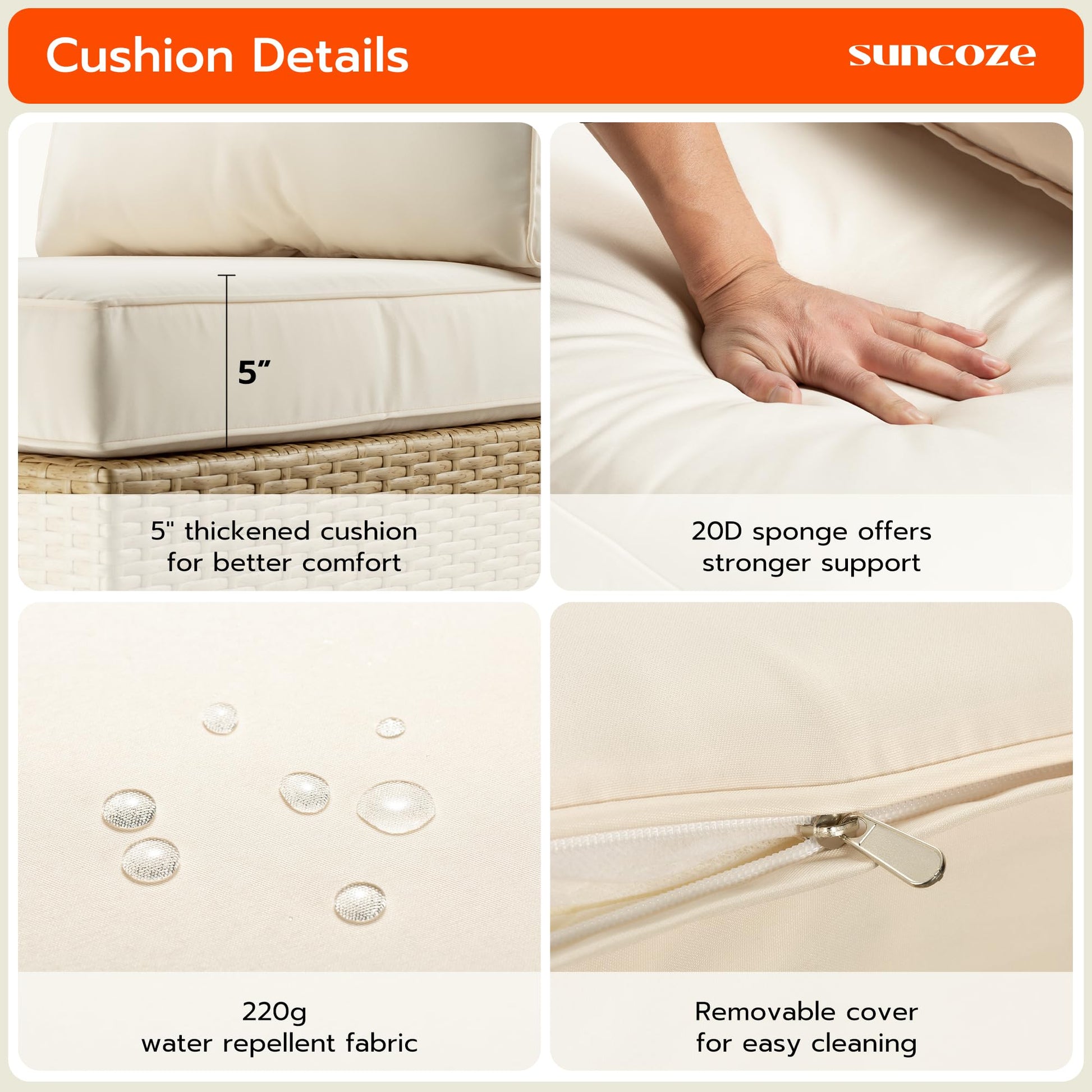 - 5" CUSHION FOR MORE COMFORT - The patio conversation sets offer exceptional comfort with 5" super thickened cushions filled with a high-resilience sandwich sponge, it also includes a 6" supportive backrest ensuring a cozy and luxurious outdoor experience than others. In addition, the removable and machine-washable covers are easy to clean and maintain.