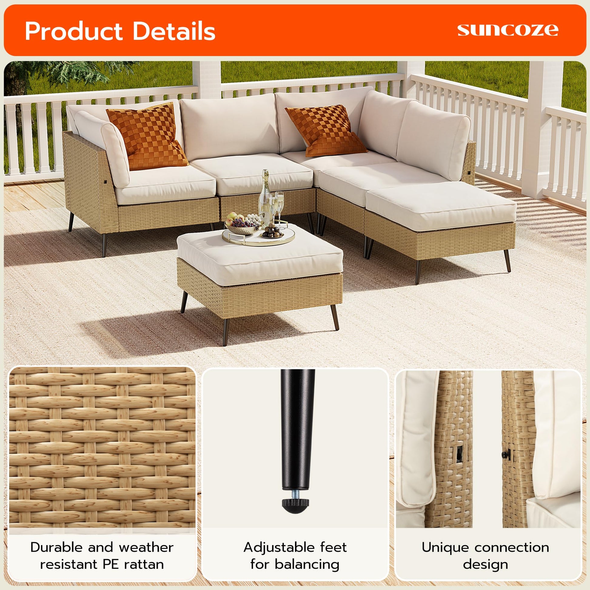 - MODULAR AND VERSATILE CONFIGURATION - The SUNCOZE patio sectional furniture set features a modular design, this outdoor couch can be freely rearranged and combined to fit various occasions and spaces. The patio sofa set comes with enough comfortable room for 4-6 family members and friends. This boho outdoor furniture will transform any outdoor and indoor space into a leisure and stylish hangout. Perfect for the backyard, garden, deck, pool and more.